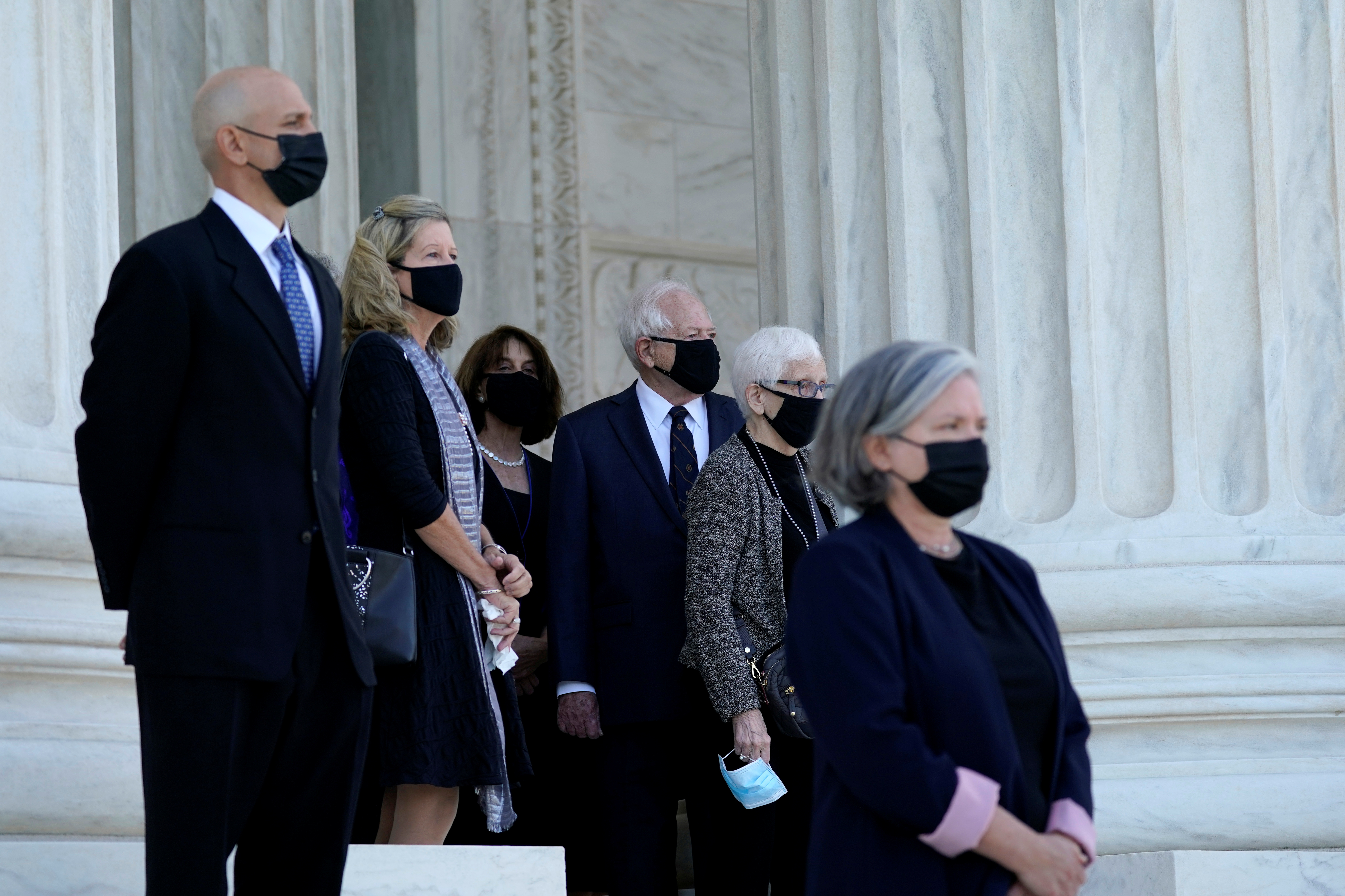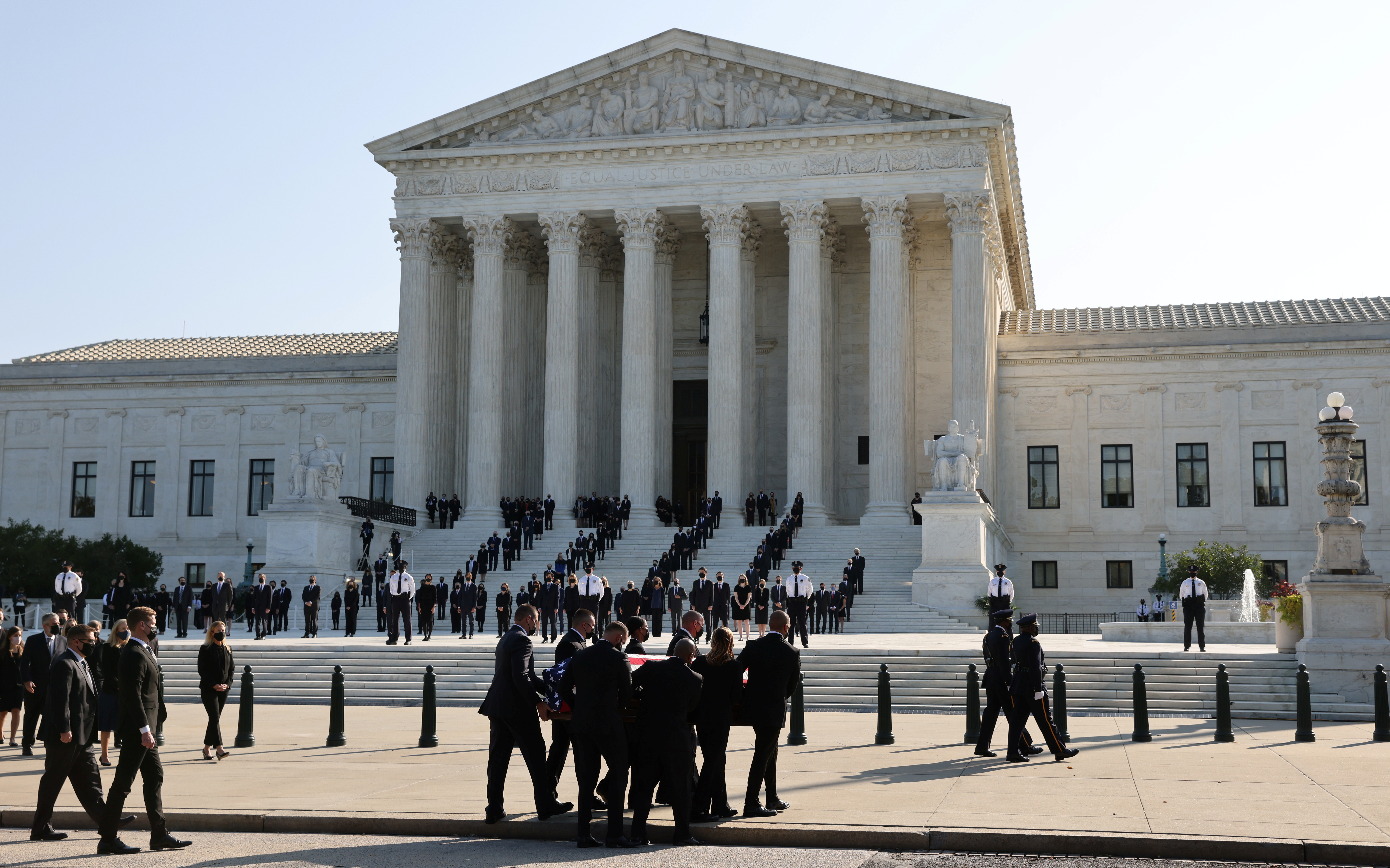 Wearing dark suits and black face masks due to the coronavirus pandemic, dozens of the liberal icon’s former clerks stood at attention as the coffin was carried up the court’s broad steps and into the Great Hall, where a private ceremony was planned for friends and family.