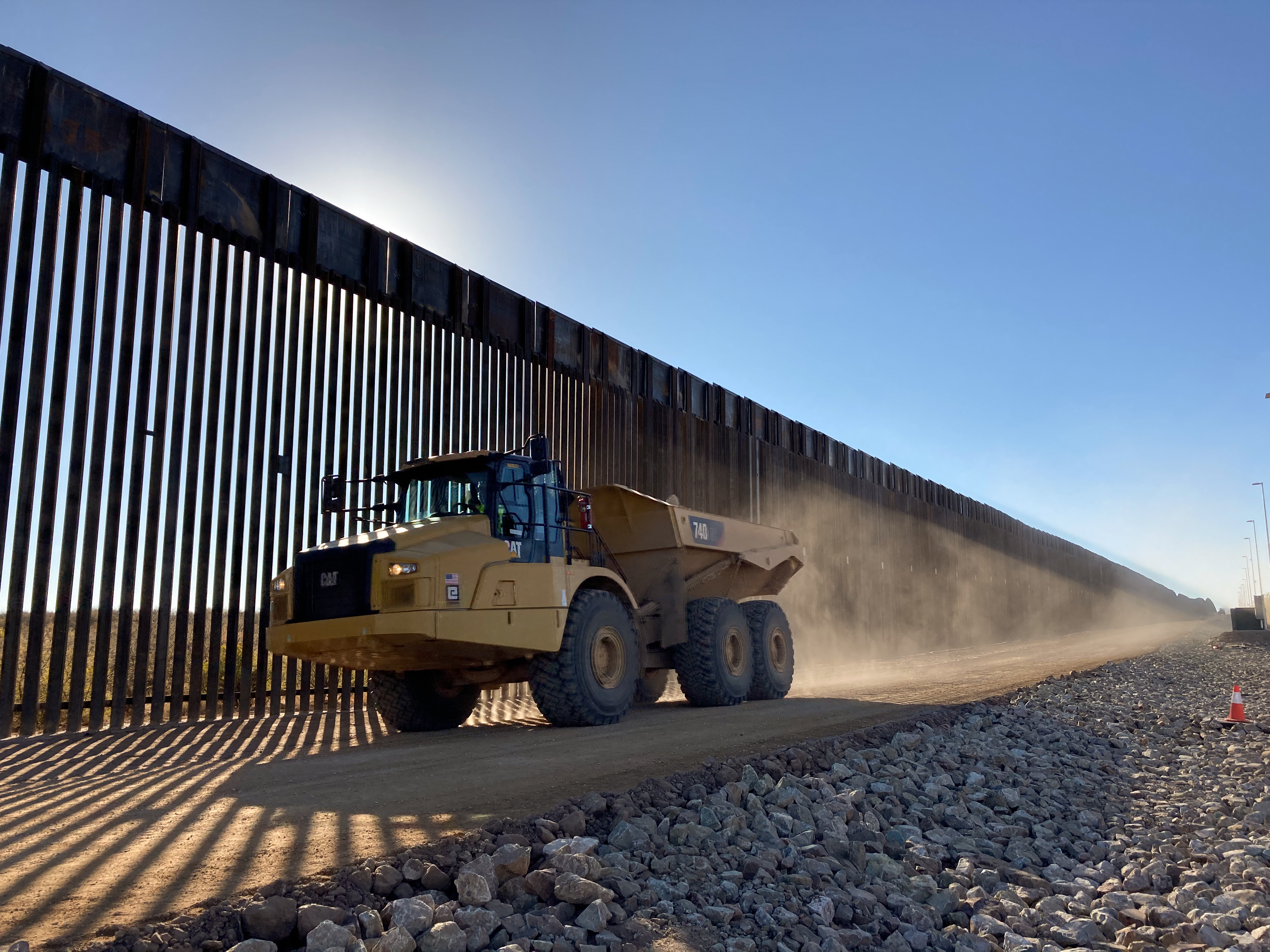 Meanwhile, 16km (10 miles) away, the sound of dynamite blasts and the roar of excavators and bulldozers echoes across Guadalupe Canyon as workers plow through the mountain. Large piles of rubble and six-metre (20-foot) boulders sit discarded in a nearby wash. Floodlights illuminate the mountains by night as crews work around the clock.