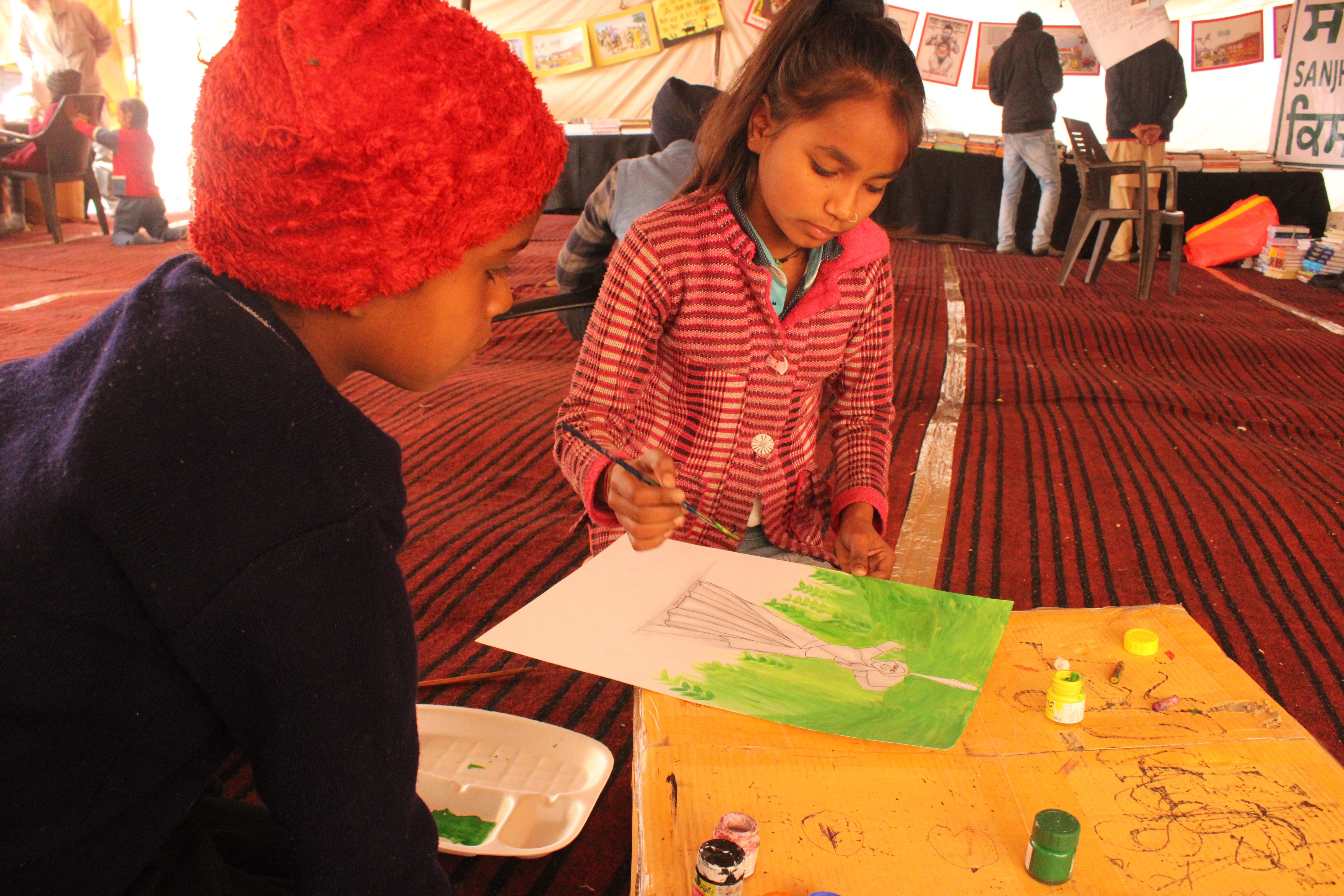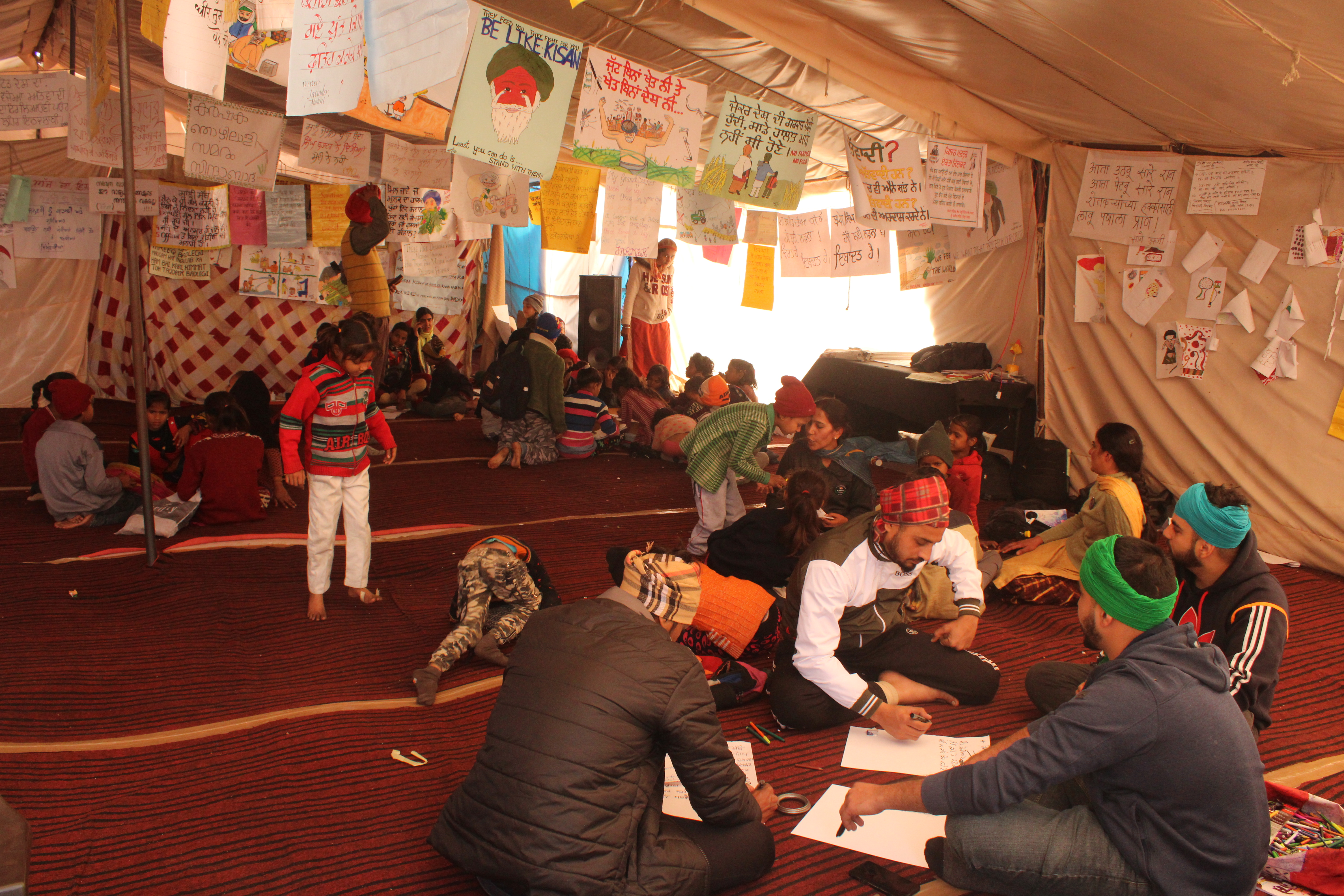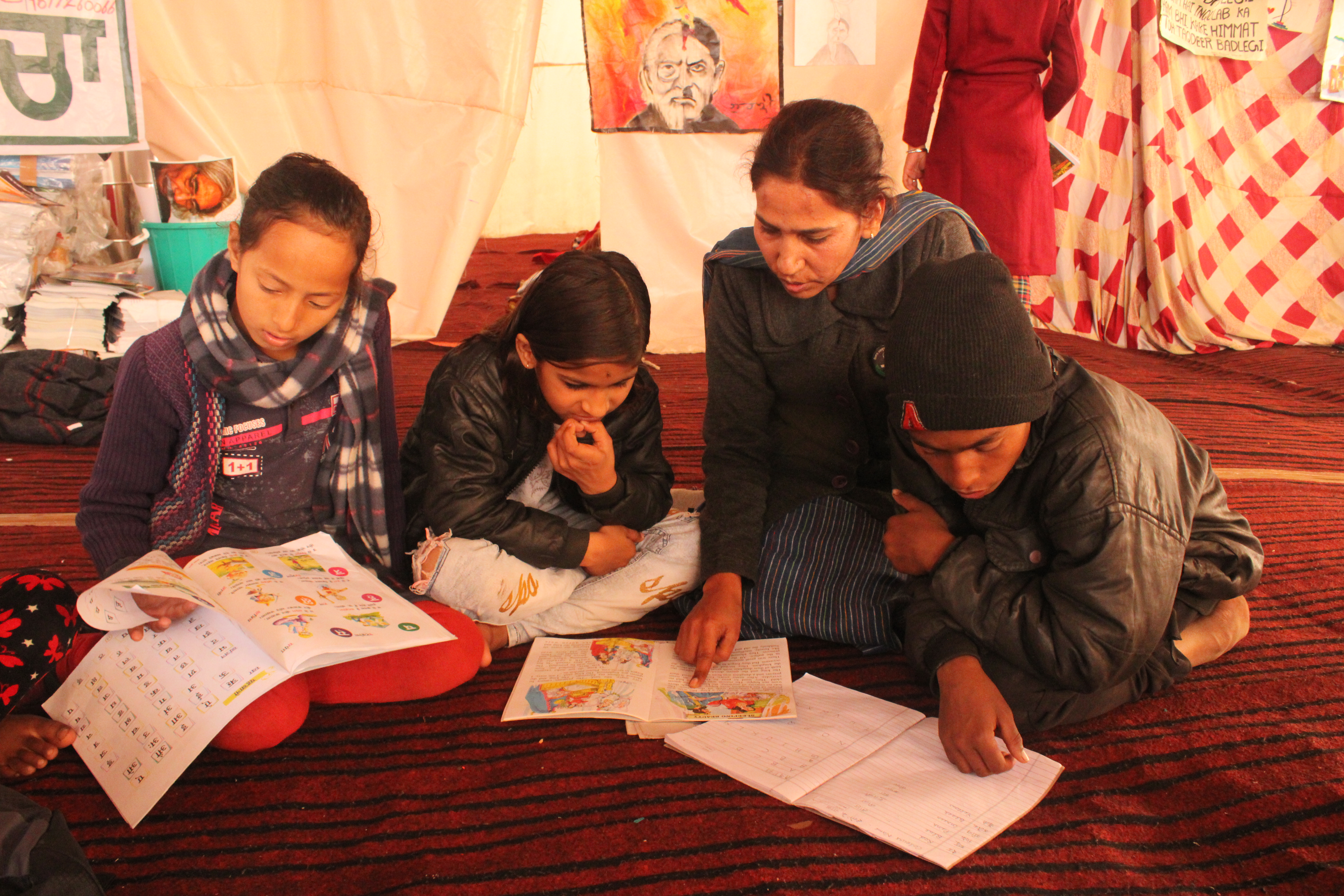 Though the makeshift school does not have a name, the tent is now called “Sanjhi Sathh”, meaning a common place, to recreate a village tradition of holding discussions on important issues.
