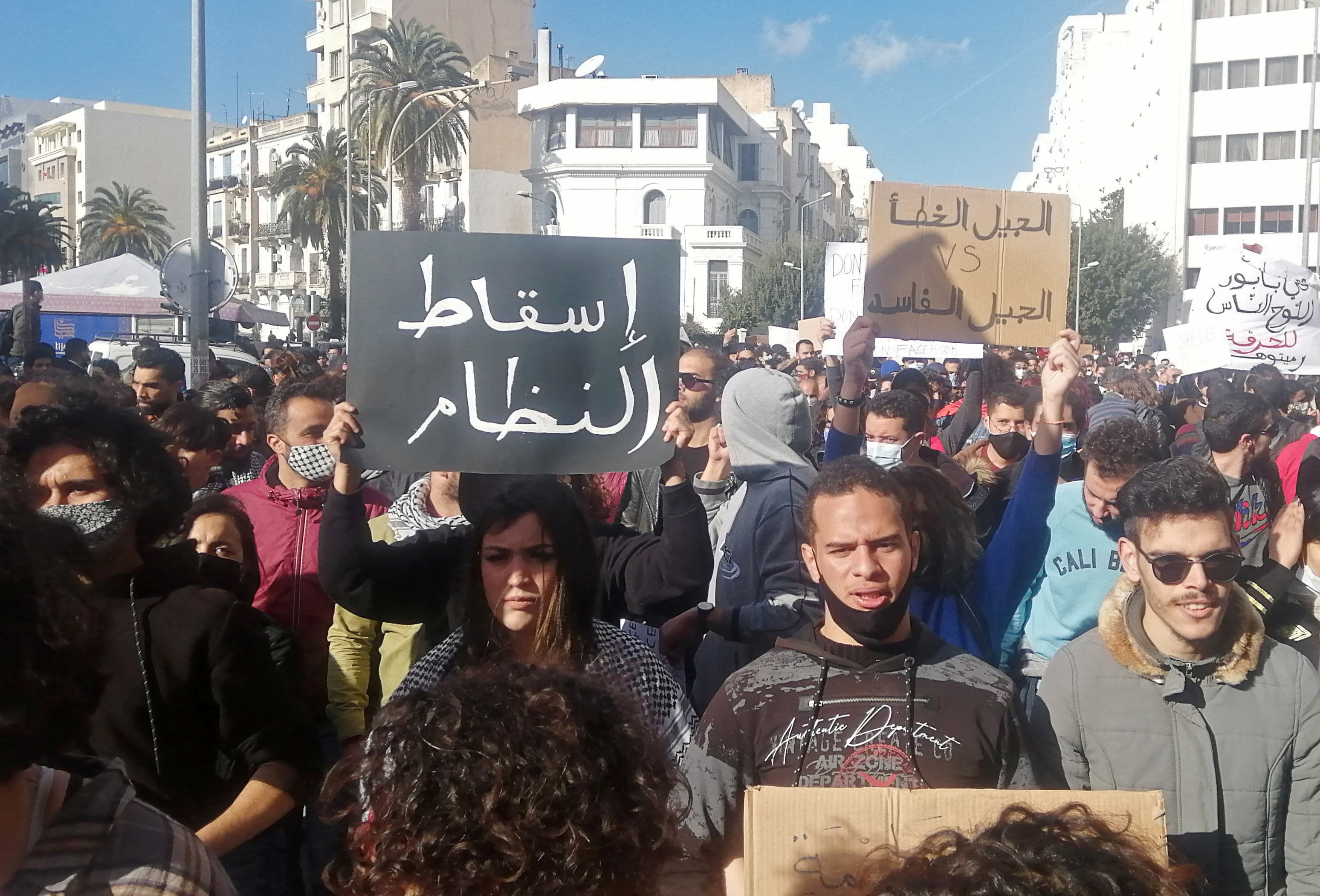 Protesters in Tunis chanted “No more fear, the streets belong to the people” and “the people want the fall of the regime” – a slogan popularised during the Arab Spring a decade ago. They also held up banners calling for the release of hundreds of protesters detained since January 14.