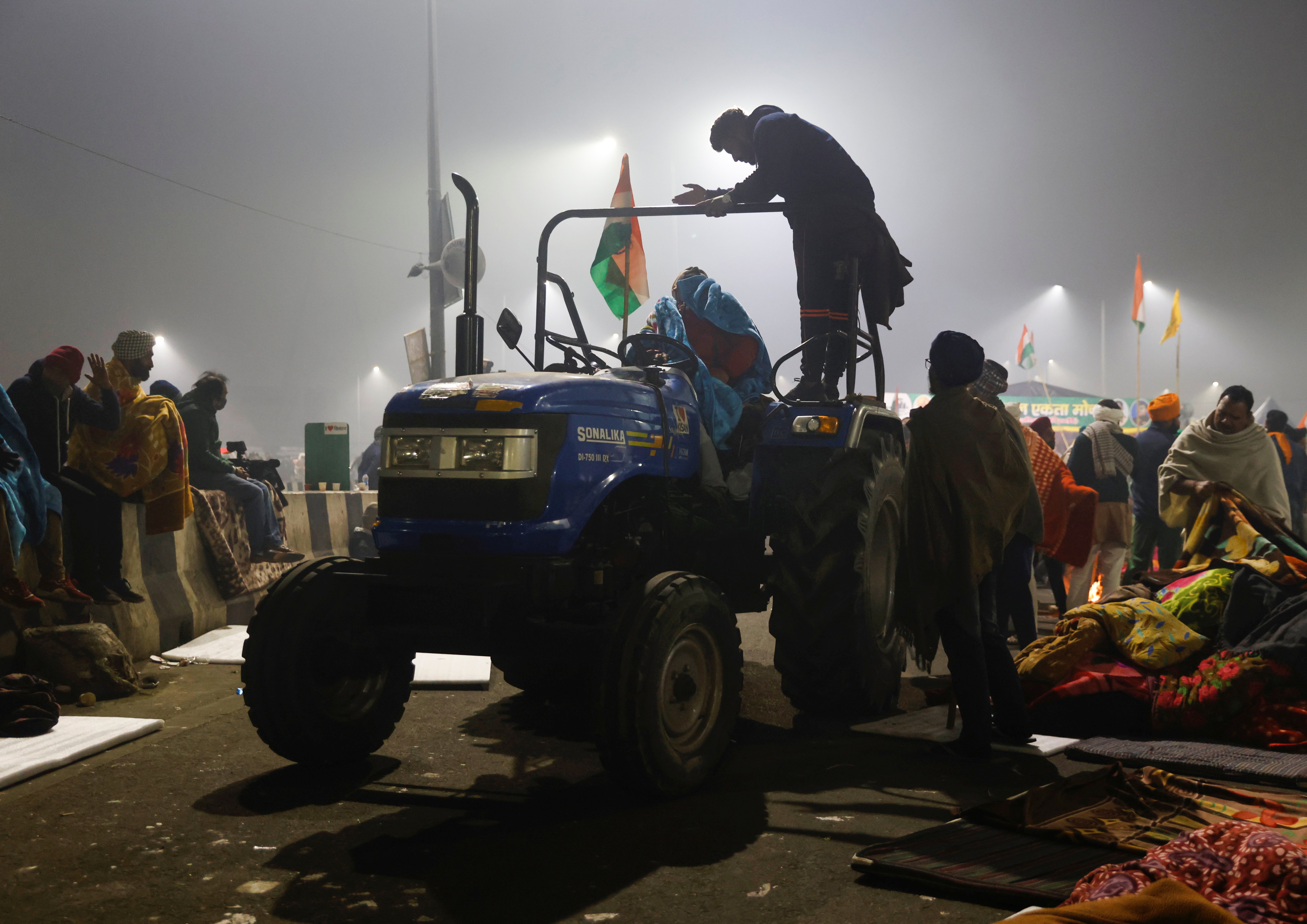 Tensions were high at the Singhu camp with many protesters carrying a stick, sword or axe – and even enormous ladles used in giant cooking pots at the camp’s kitchens – while regular announcements over a public annoucement system in Punjabi told people to stay awake and alert.