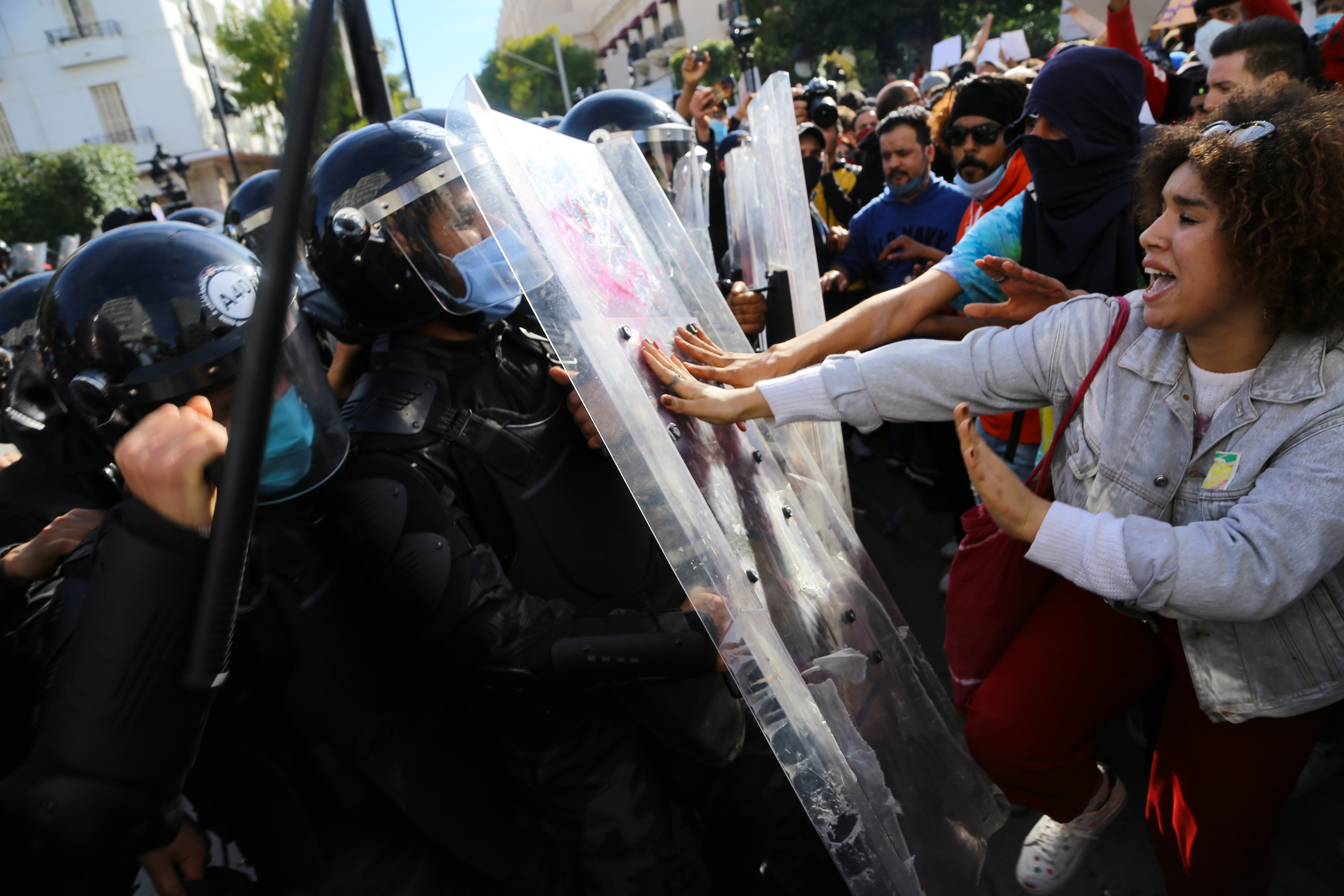 In Tunis, hundreds joined a protest in the centre of the capital on Saturday with scuffles erupting as police blocked the way to the main Avenue Habib Bourguiba, where the Interior Ministry building is located.