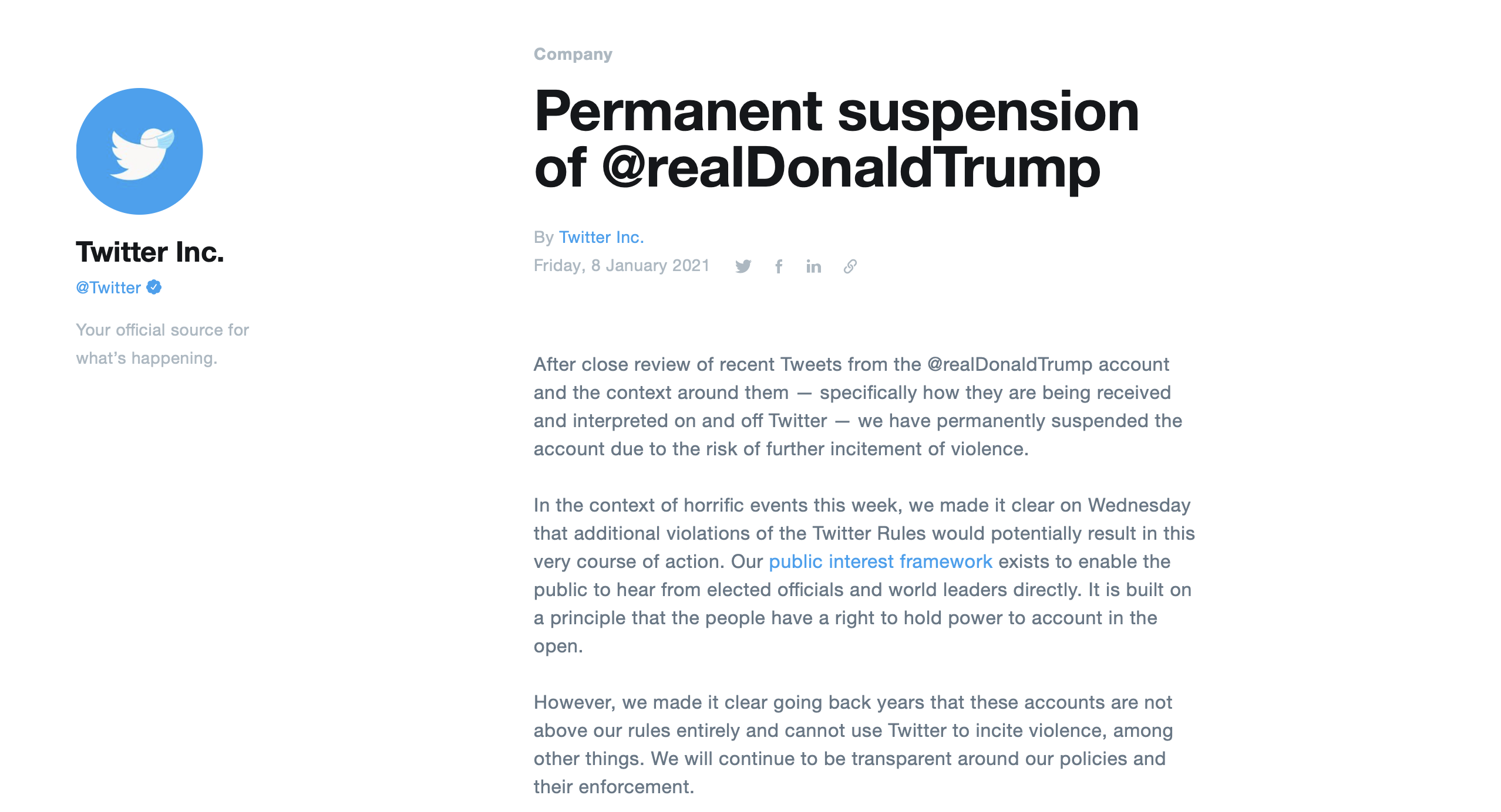 Twitter judged that second tweet was “received by a number of his supporters as further confirmation that the election was not legitimate” and “may also serve as encouragement to those potentially considering violent acts that the Inauguration would be a ‘safe’ target because he would not be attending”.