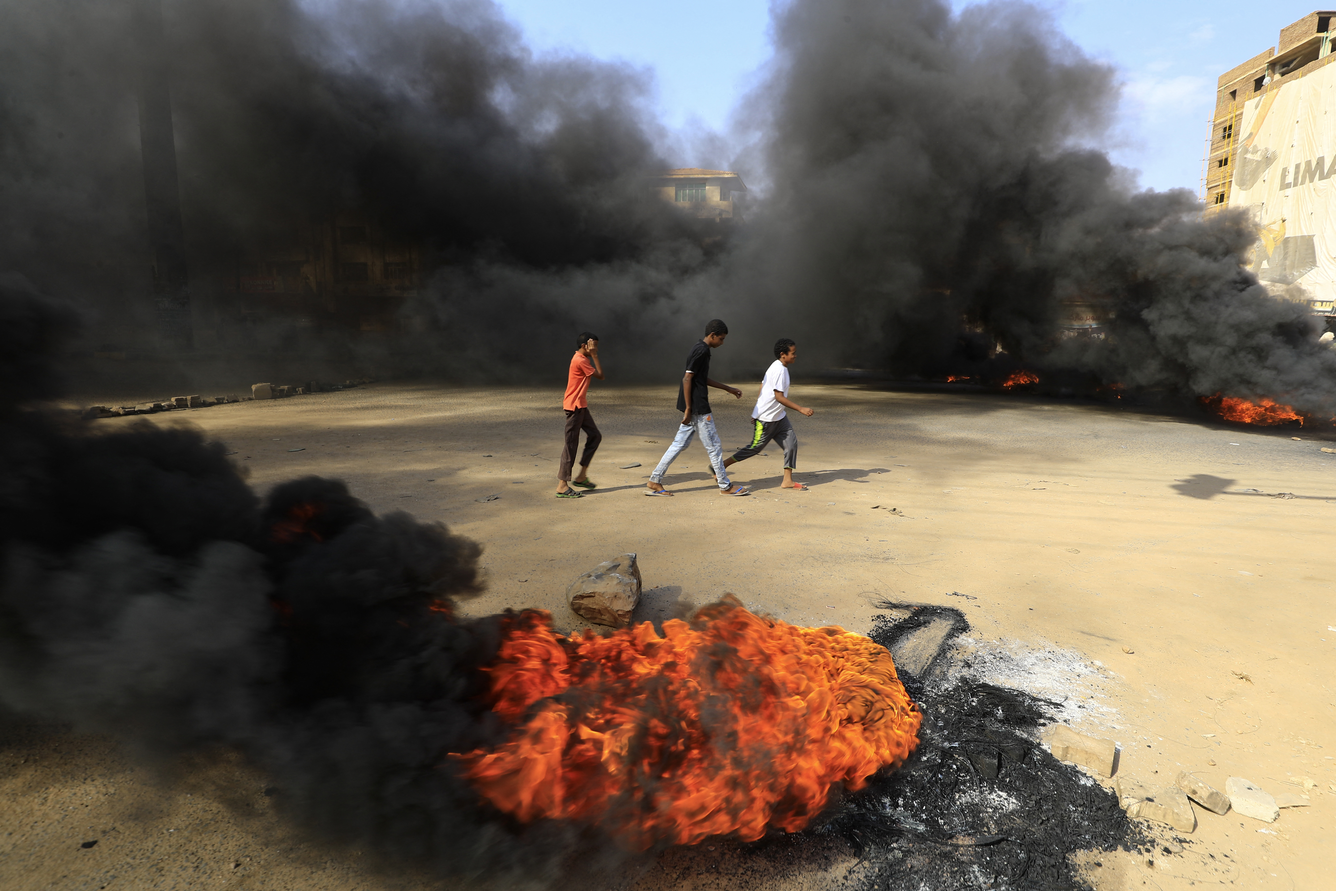 Soldiers were stationed on the streets of Khartoum and restricted civilians’ movements, as protesters opposed to the military takeover carried the national flag and burned tyres across the city.