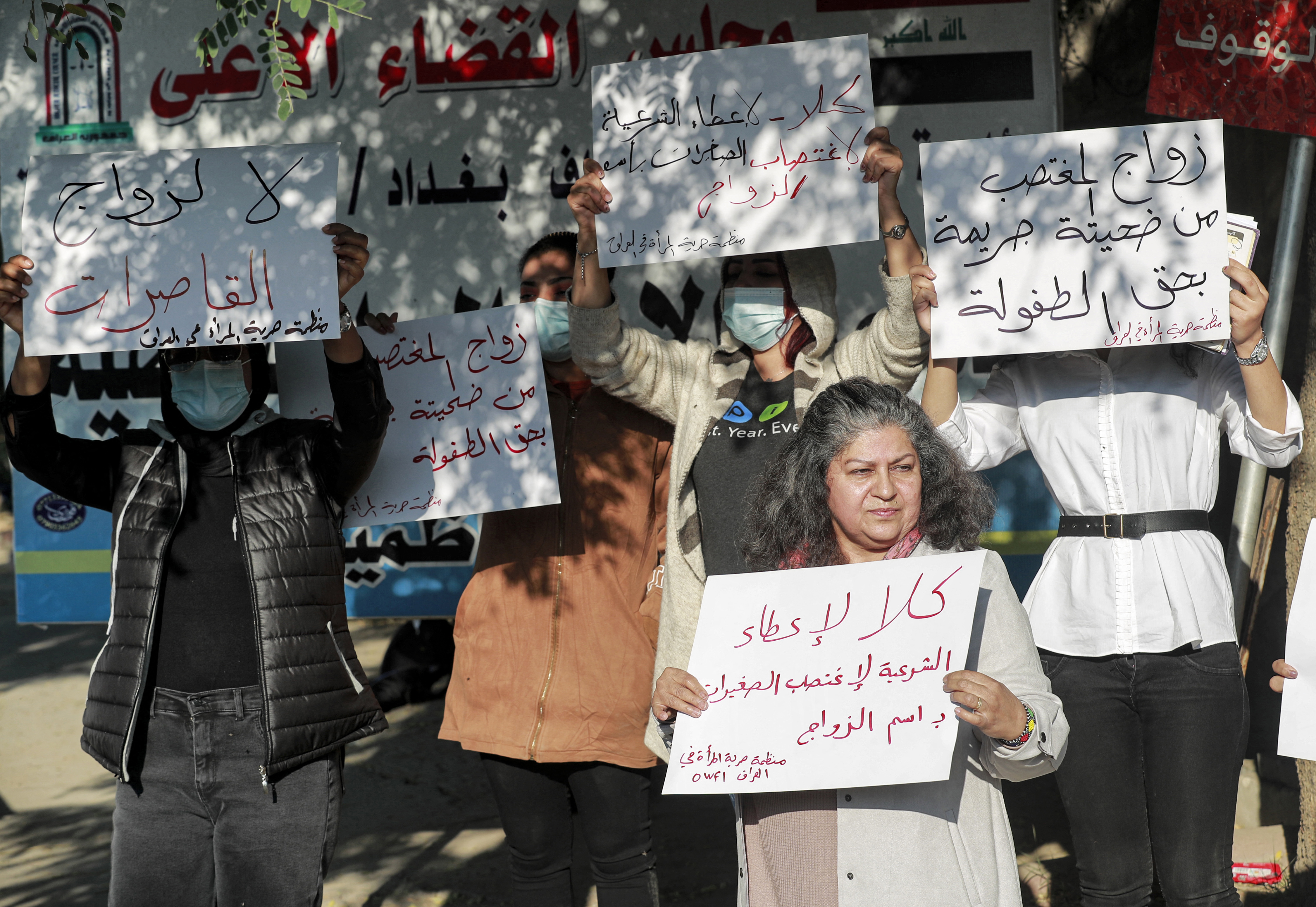 The court, located in Baghdad’s Kadhamiya district, adjourned the case last week as demonstrators rallied in front of the court, chanting and holding banners with slogans such as: “Child marriage is a crime against children,” and “No to child marriage”.