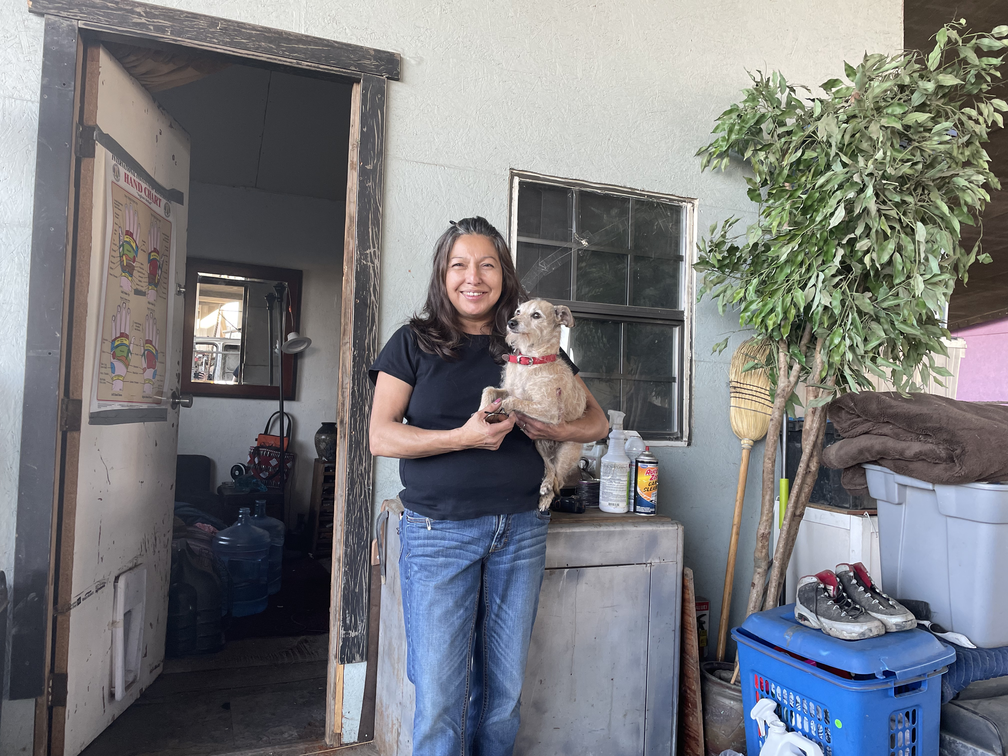 Her timid eight-year-old dog, Little, scurries back and forth from the couch to the porch. Her home lacks water and electricity, but she says she feels safer now: “You have a higher possibility of your things being there when you come back.”