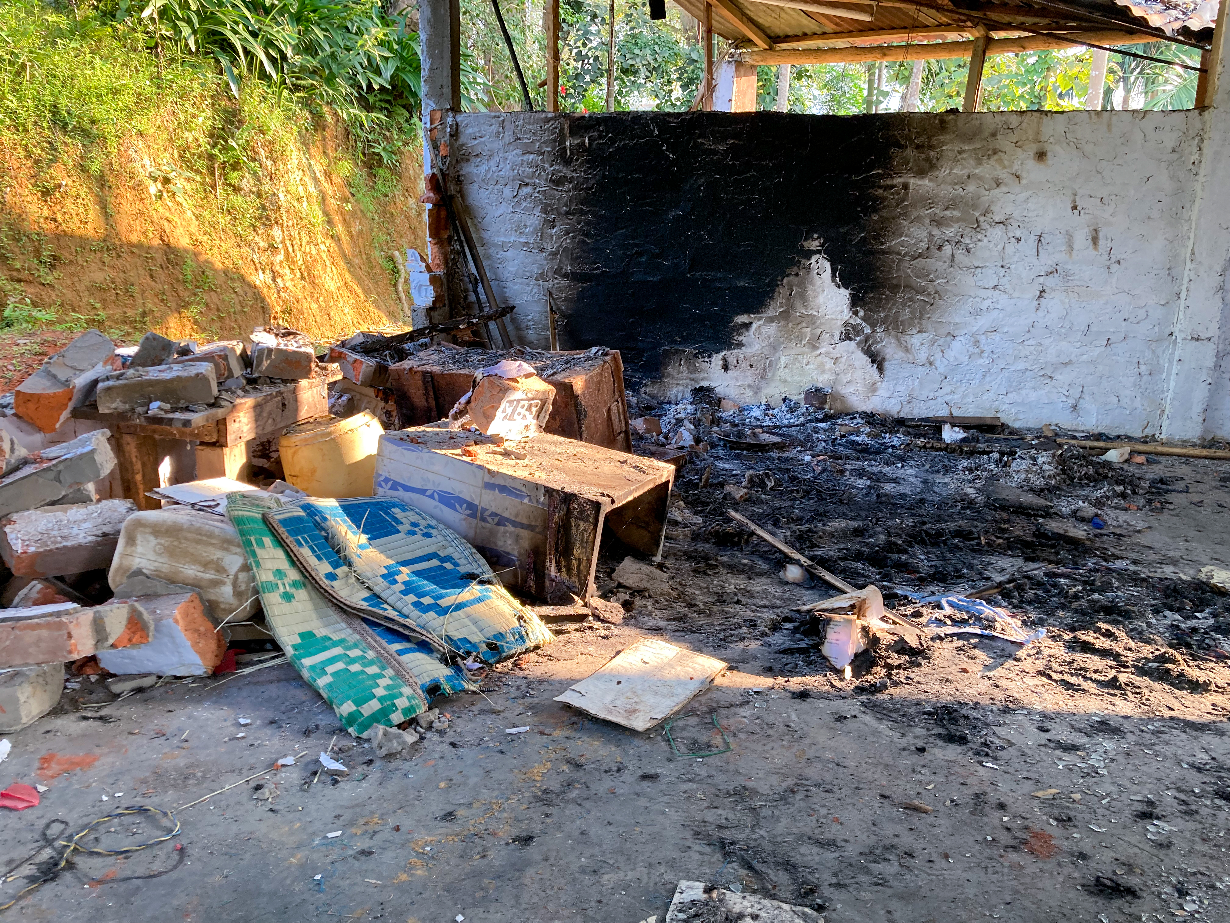 Religious books and other items had turned into ashes inside the tin-roofed mosque and a portion of its wall was brought down.