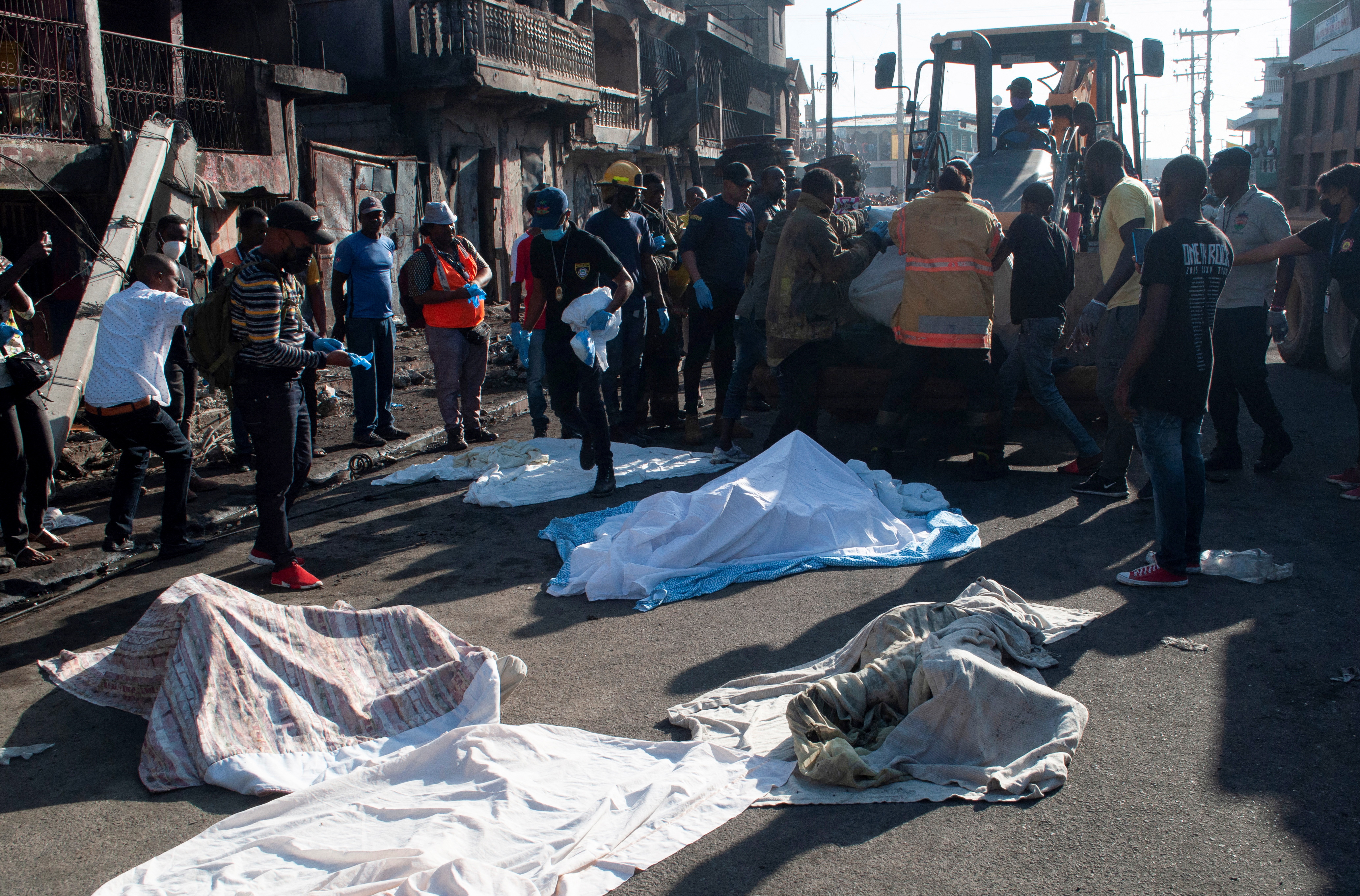 As rescue workers cleaned up in the aftermath of the explosion in Cap-Haitien, bodies covered in white sheets lay on the ground before they were loaded on to trucks to be taken away.