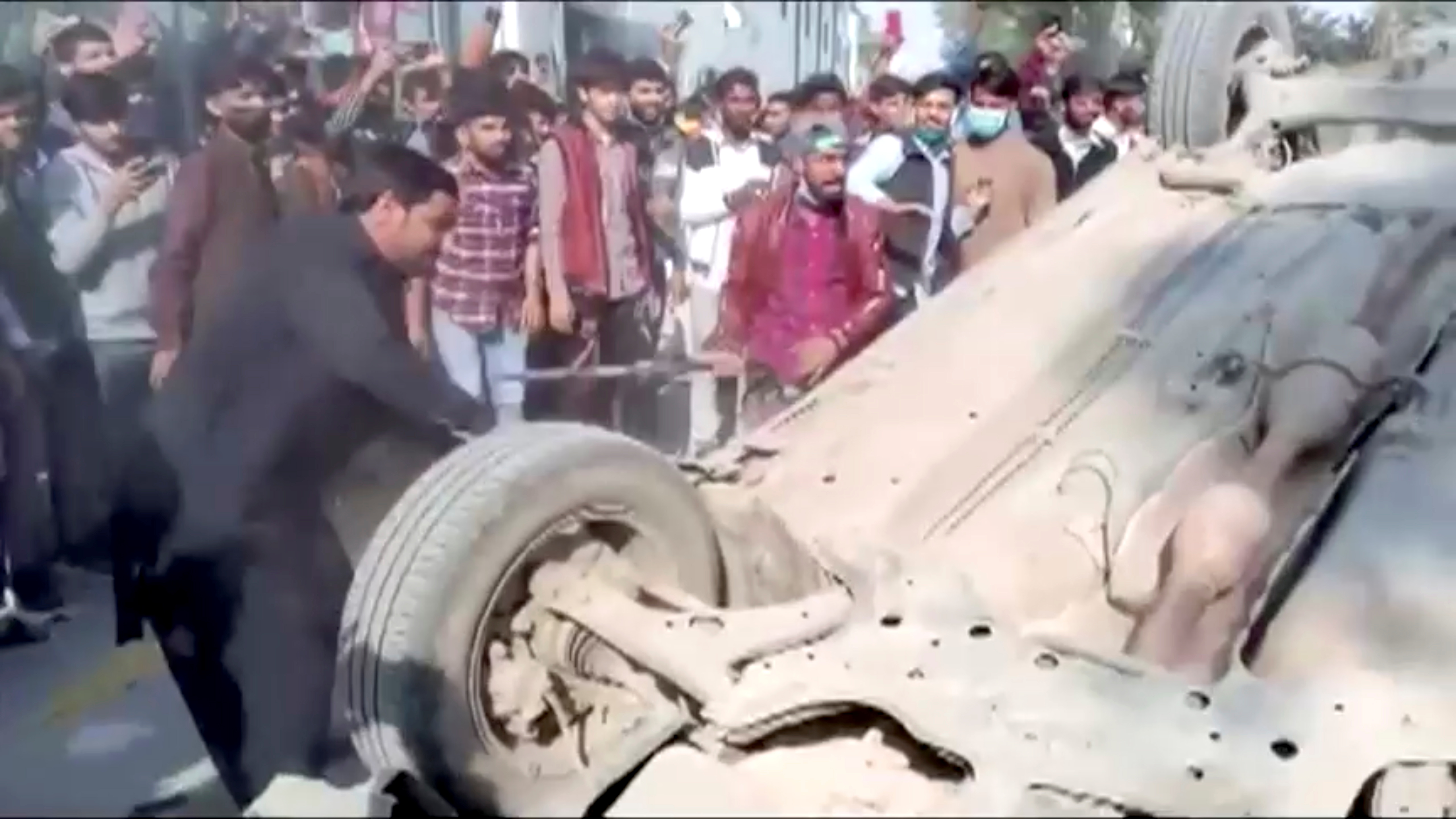 Several gruesome video clips shared on social media showed a mob beating the victim while chanting slogans against blasphemy on Friday. Other clips showed his body set ablaze, as well as the overturned wreckage of what was said to be his car.