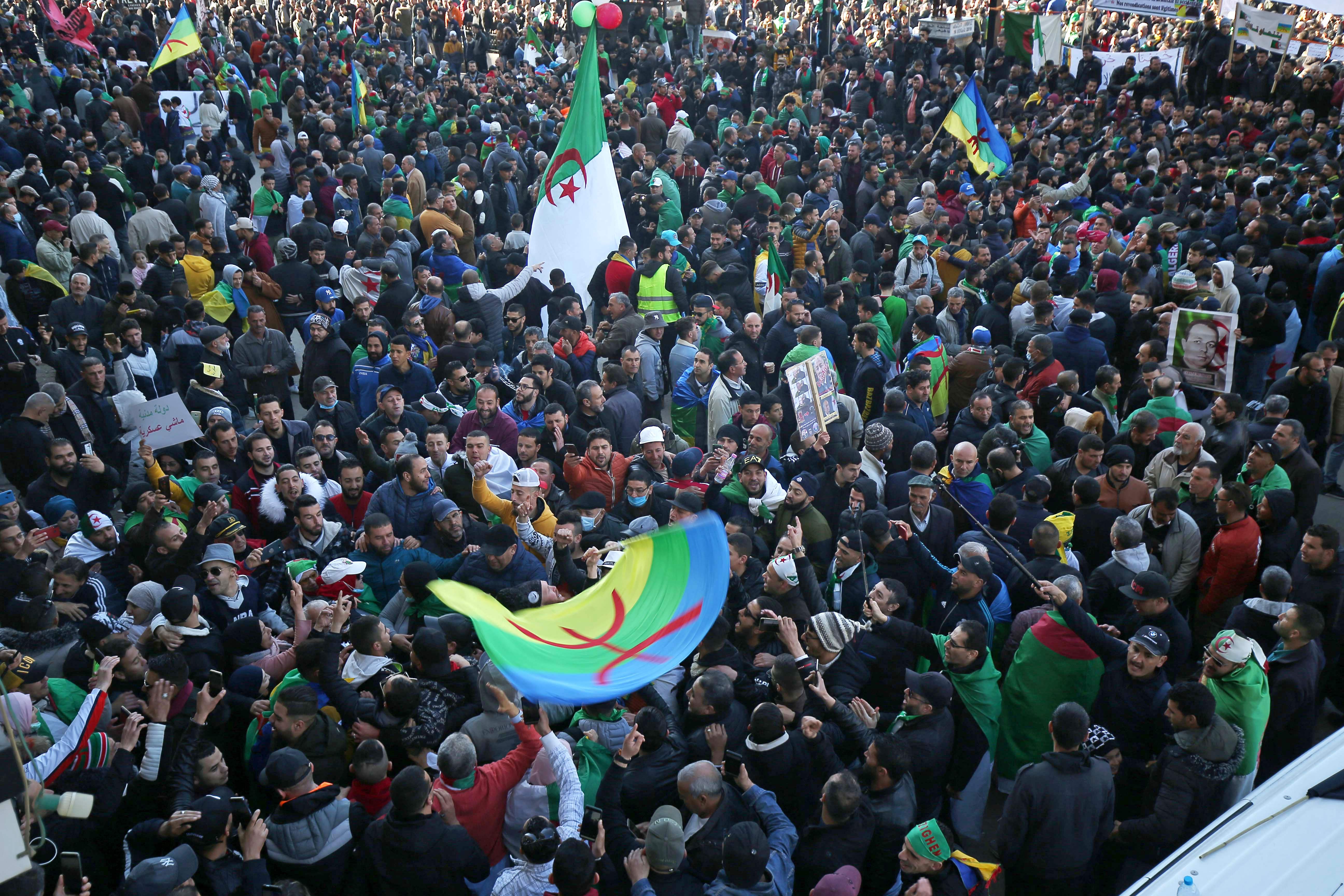 They chanted “a civilian state, not a military state” and “the gang must go” as they brandished Berber and Algerian flags.