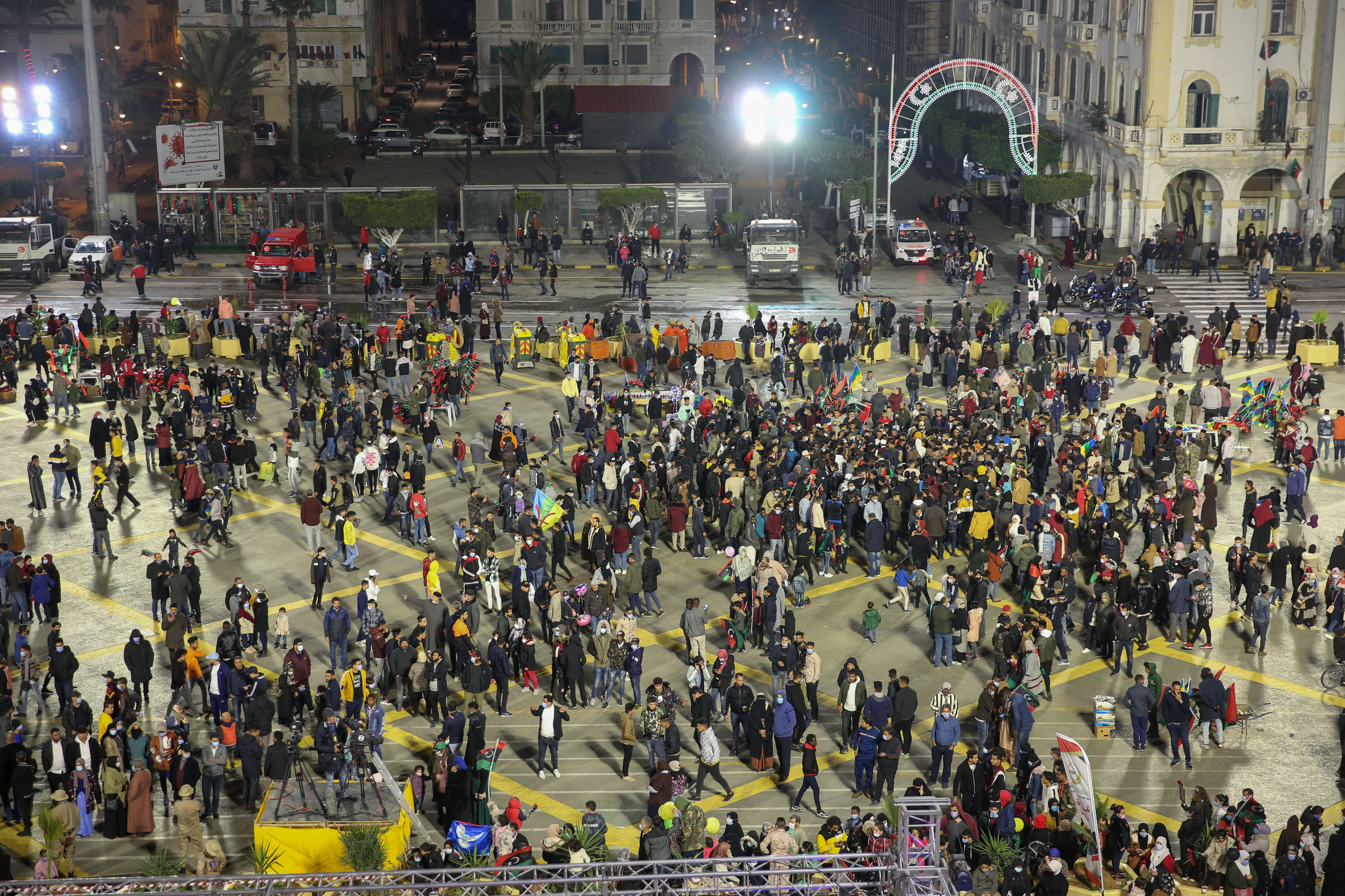 Celebrations began late on Tuesday in the capital, Tripoli, where people gathered in the city’s main square amid tight security. The city’s main streets and squares were cleaned and decorated with banners and photos marking the anniversary. Festivities also rang out in other cities in the south.