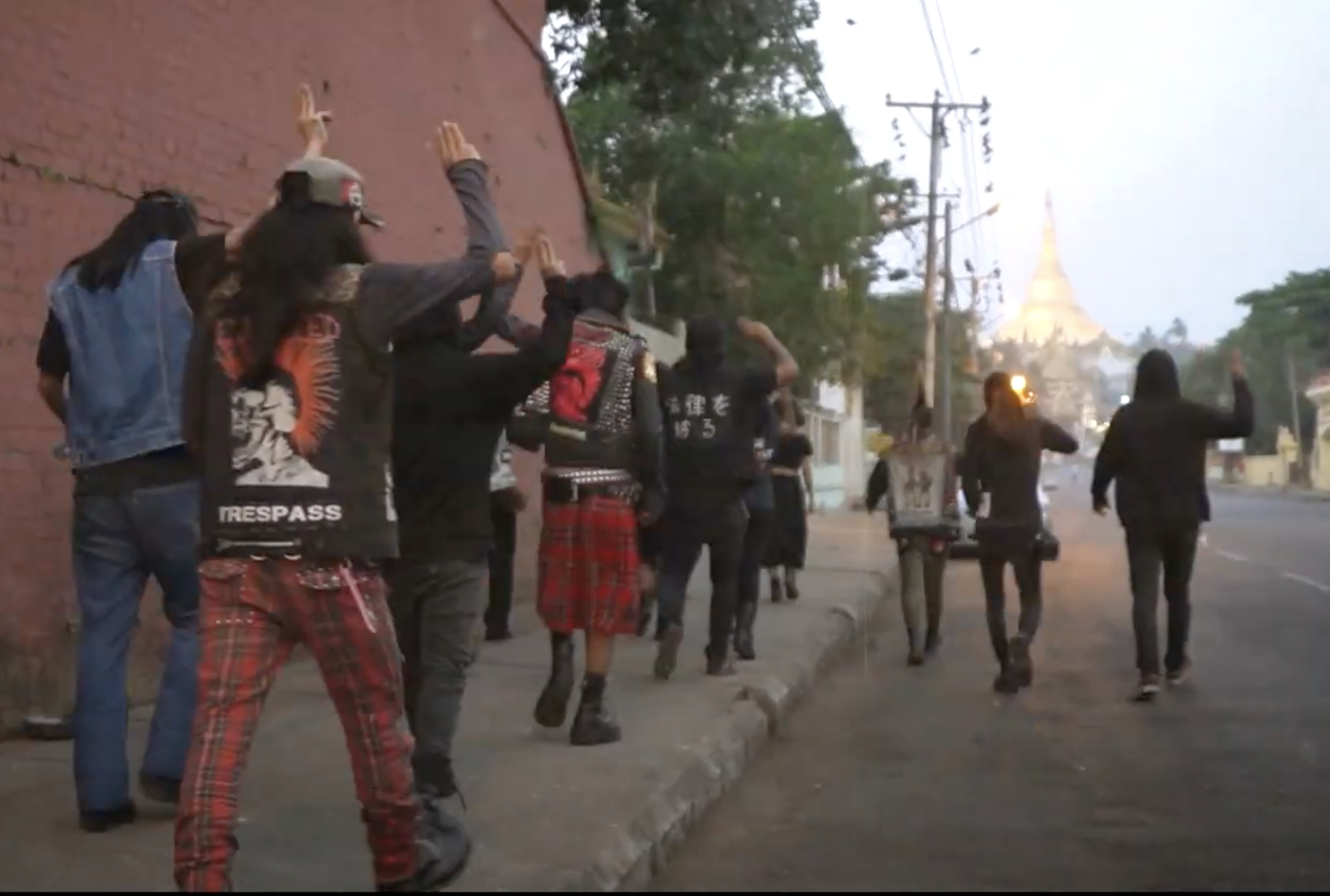 In the background, mohawked and leather-jacketed punks wave red and black flags and raise three fingers, a symbol of resistance derived from popular film series, The Hunger Games, and adopted by Myanmar’s anti-coup protesters.