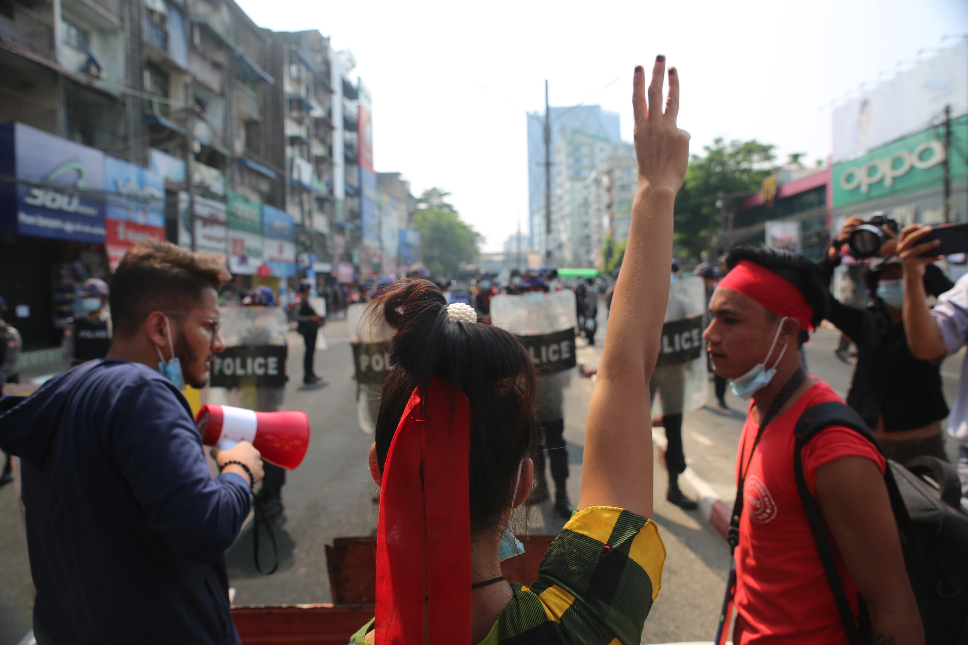 At the colonial-era City Hall in Myanmar’s largest city, hundreds were on the streets, with more police at hand and water cannon again on standby. Crowds were also forming elsewhere in the city, including the Hledan Center where youth activists have been demonstrating for the past three days.