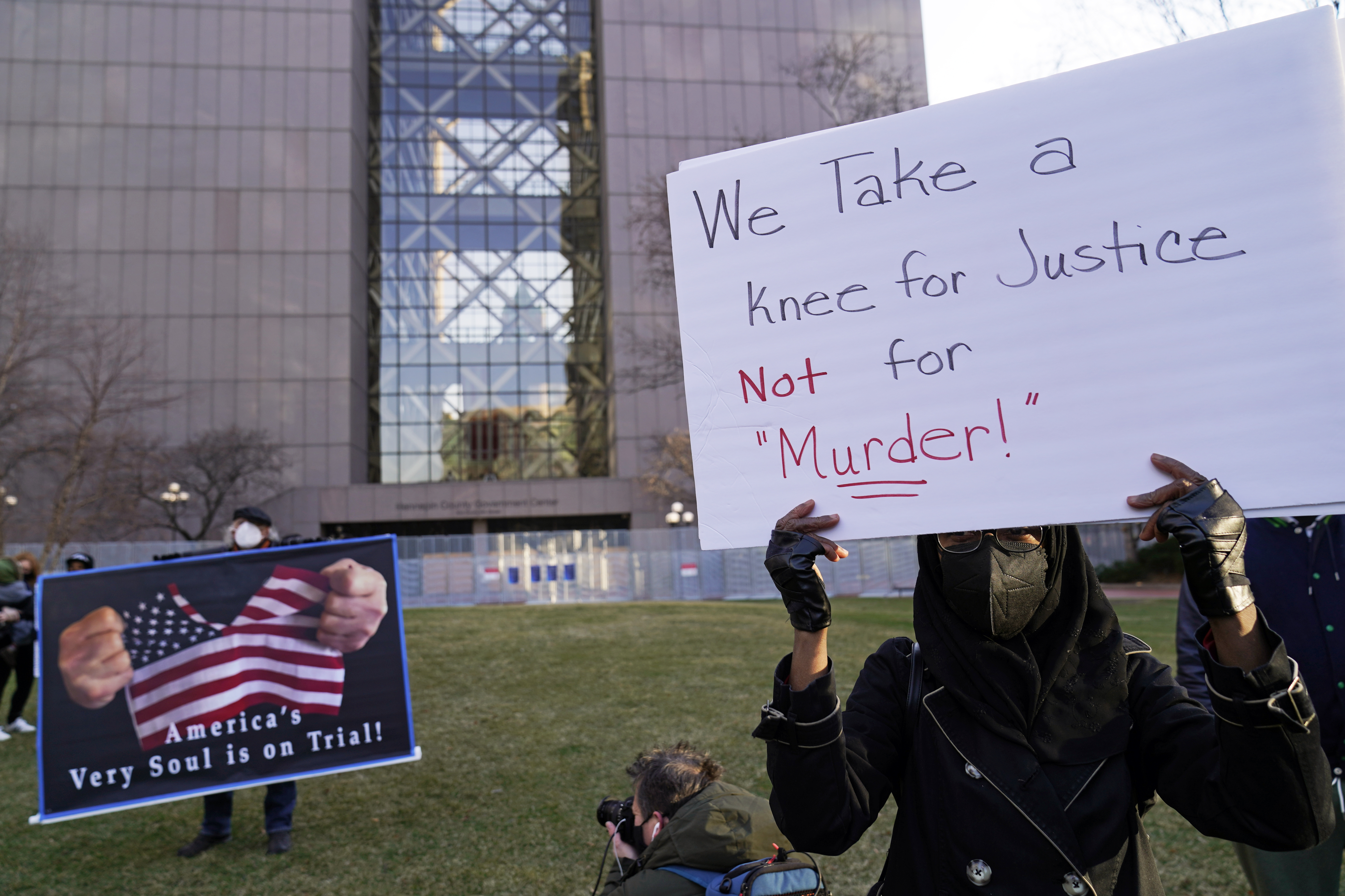 Monday’s proceedings began with Floyd’s family members and civil rights lawyers taking a knee for eight minutes and 46 seconds – the time Chauvin kneeled on Floyd’s neck – in front of the Hennepin County court.