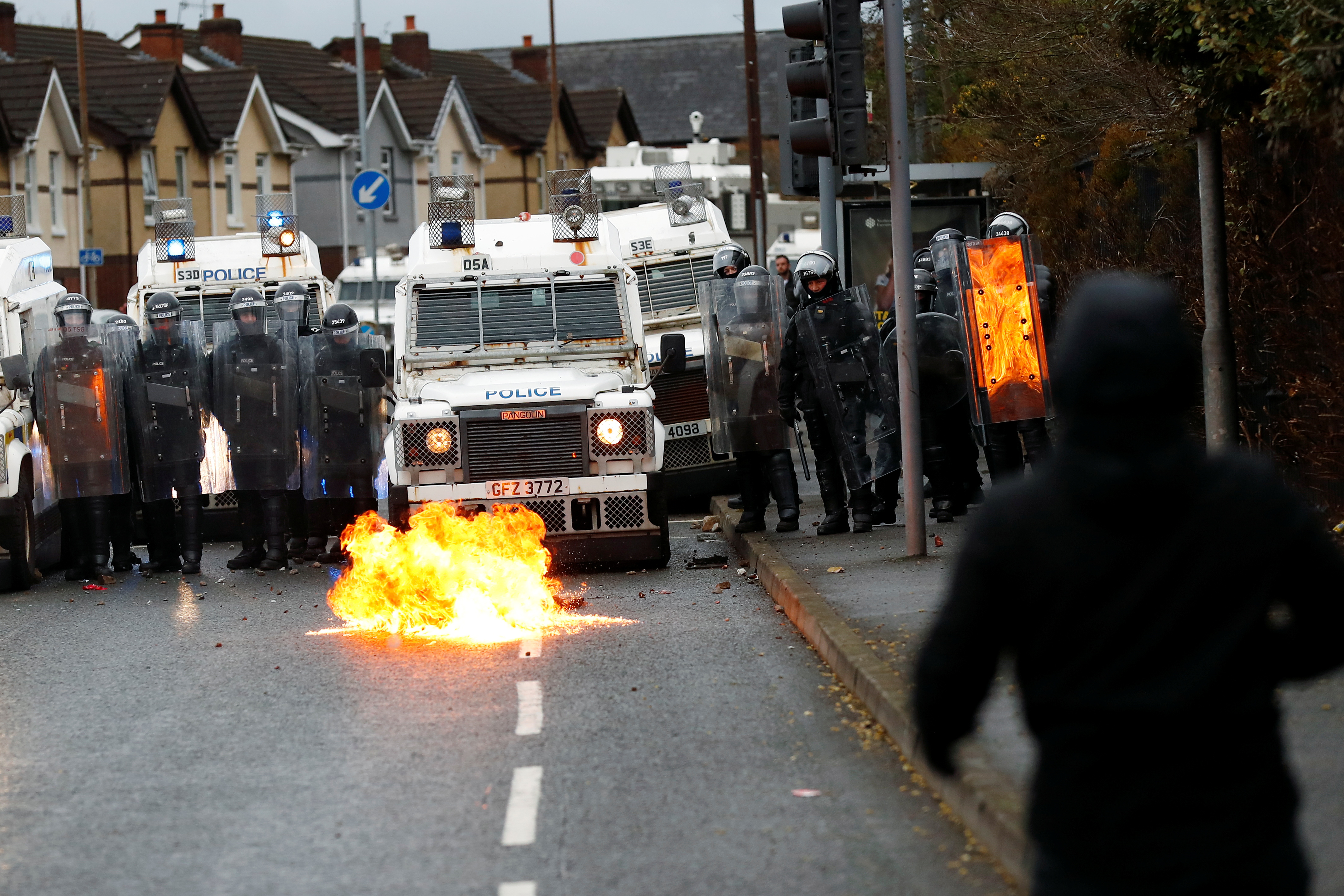 Over the following days, disturbances took place across Northern Ireland, with cars being hijacked, bins set on fire, and an empty bus petrol-bombed.