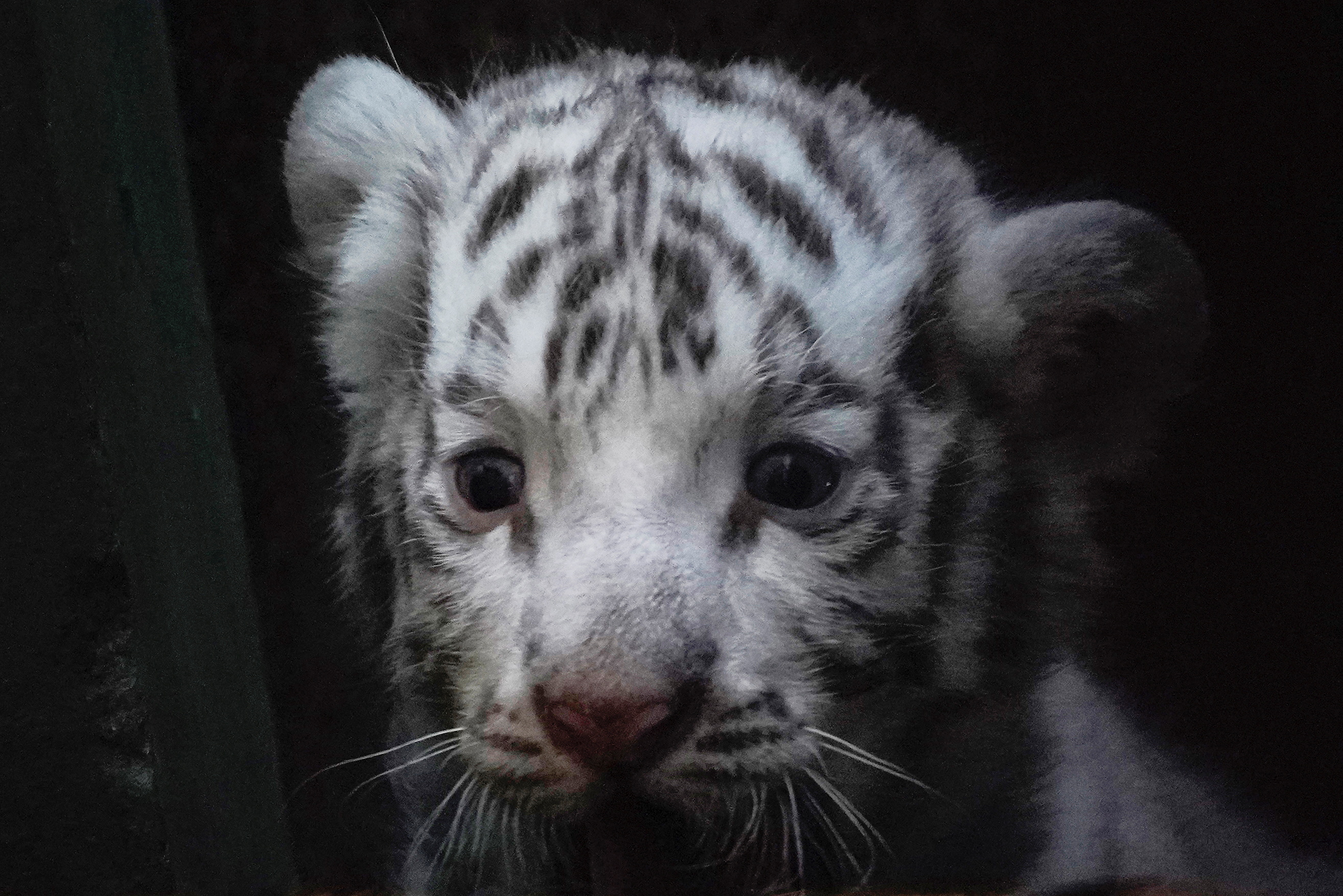 The tiger is one of four born on March 12 – white tigers are a genetic variation of orange Bengal tigers.