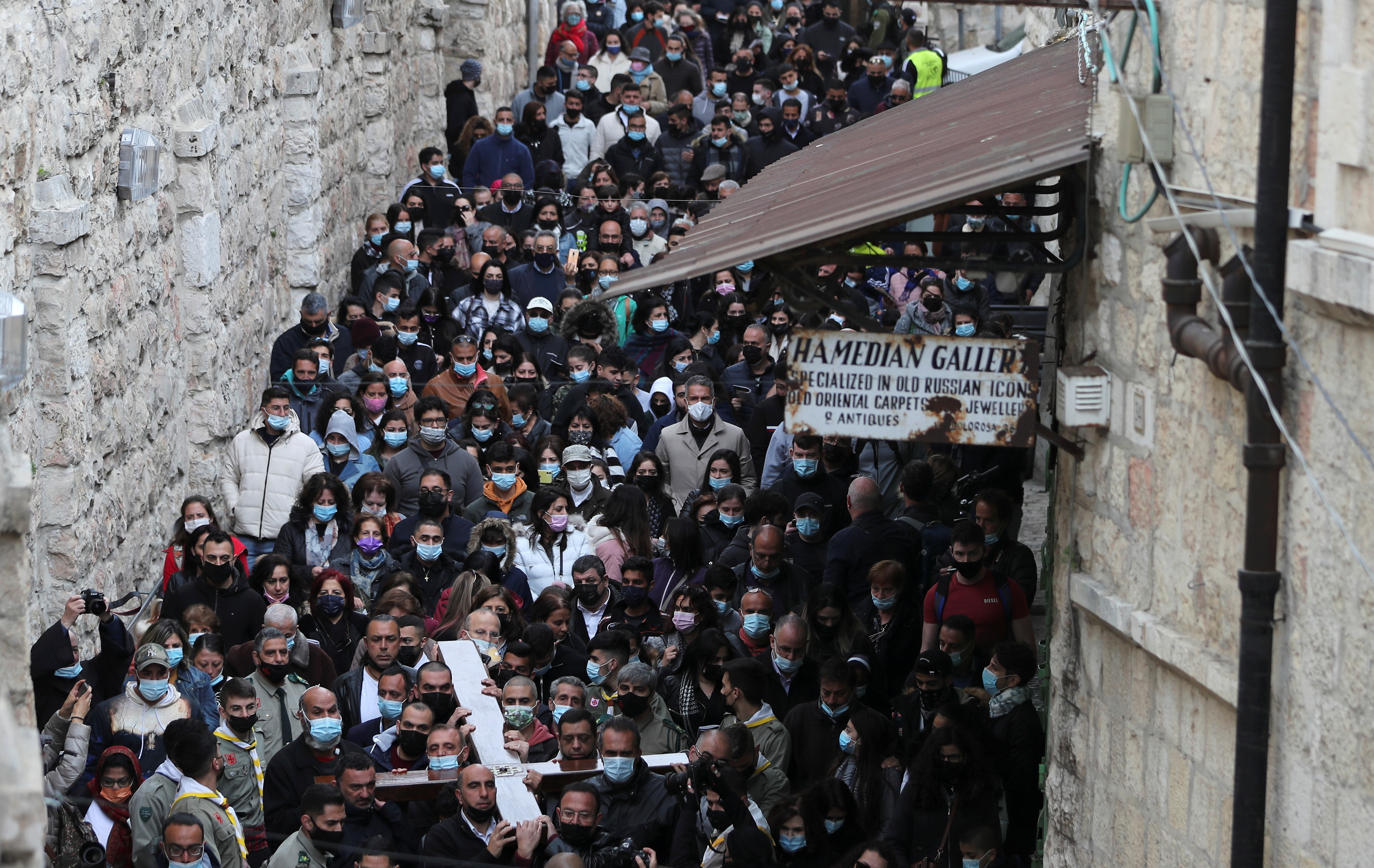 Another group carried a wooden cross along the route through the Old City, singing hymns and pausing to offer prayers.