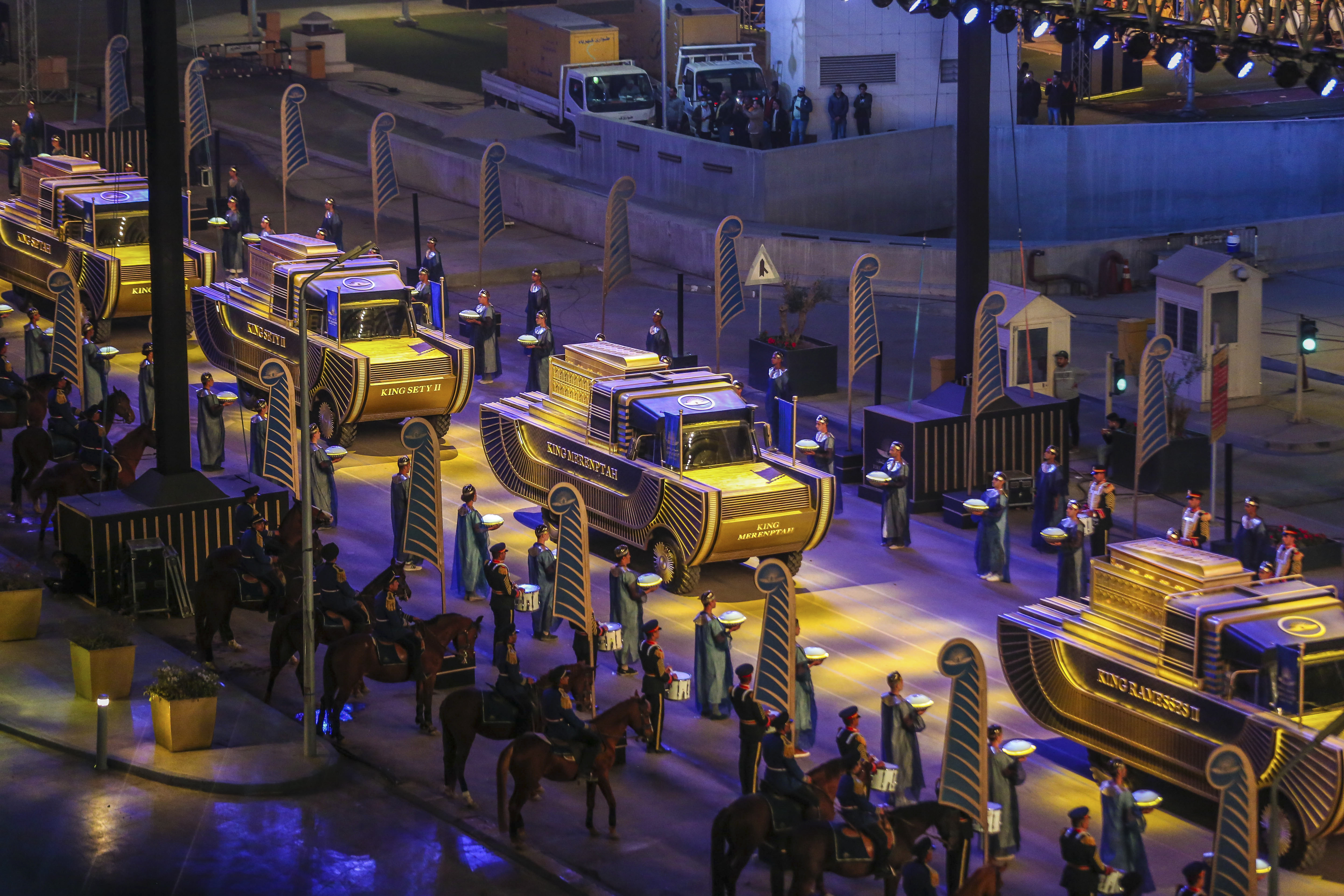Under heavy security, the mummified remains of the pharaohs and other royals were transported in climate-controlled cases loaded onto trucks decorated with wings and pharaonic design for the hour-long journey from their previous home in the older, Egyptian Museum.