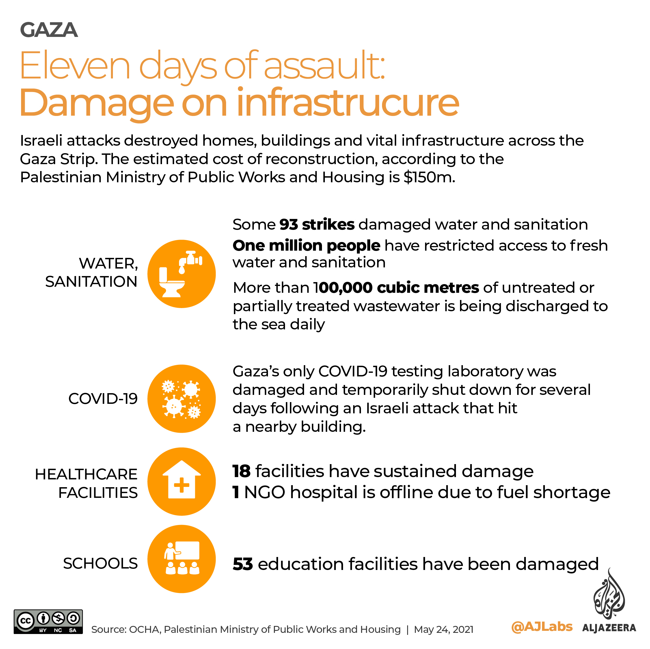 Israel’s siege of Gaza has also stopped the flow of construction materials needed to rebuild much of the enclave’s infrastructure, which was damaged in the previous Israeli military campaigns of 2008, 2012 and 2014.