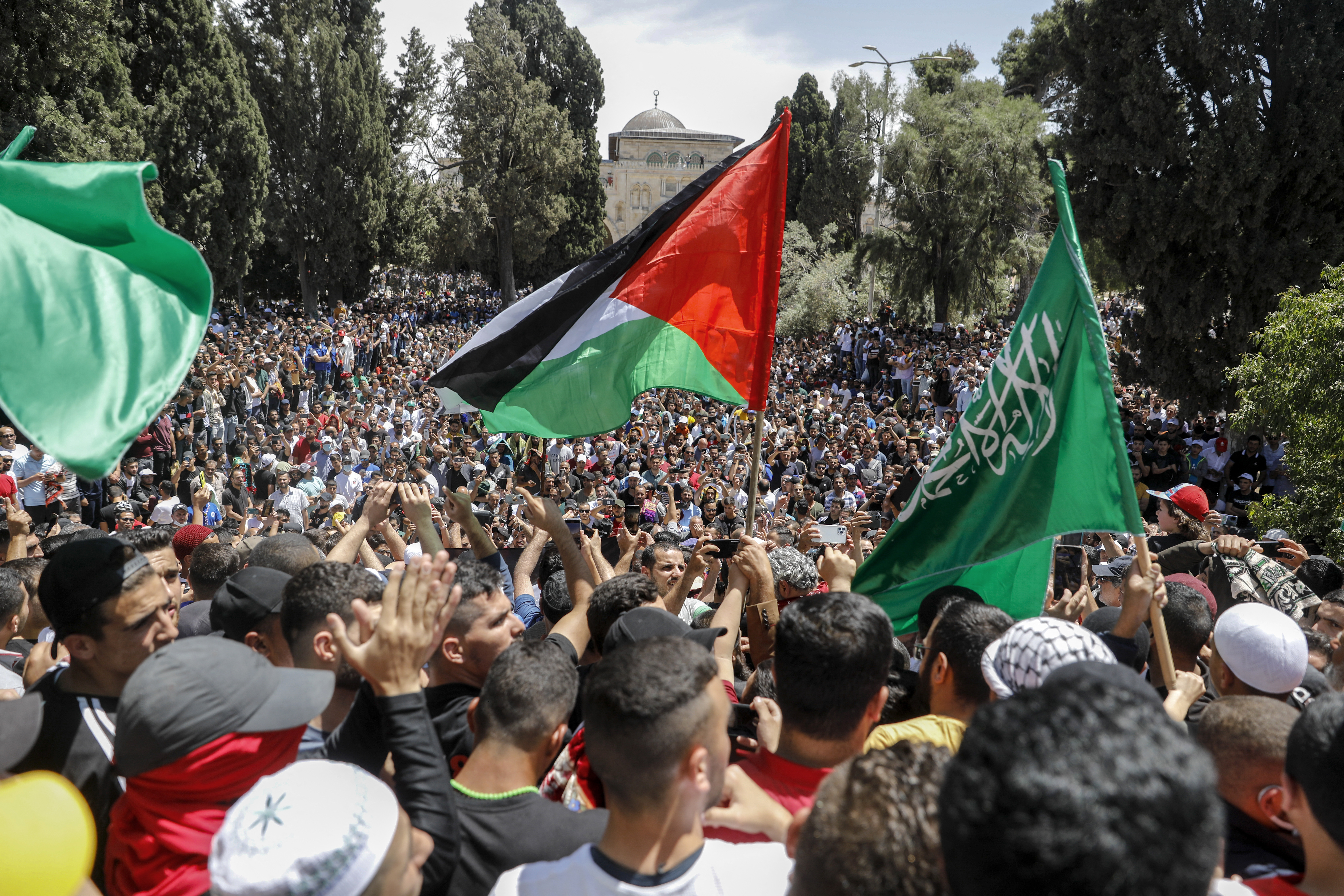 Tens of thousands of Palestinian worshippers earlier packed into the mosque on the final Friday of Ramadan, and many stayed on to protest in support of Palestinians facing eviction from their homes on Israeli-occupied land claimed by Jewish settlers in the Sheikh Jarrah neighbourhood of East Jerusalem.