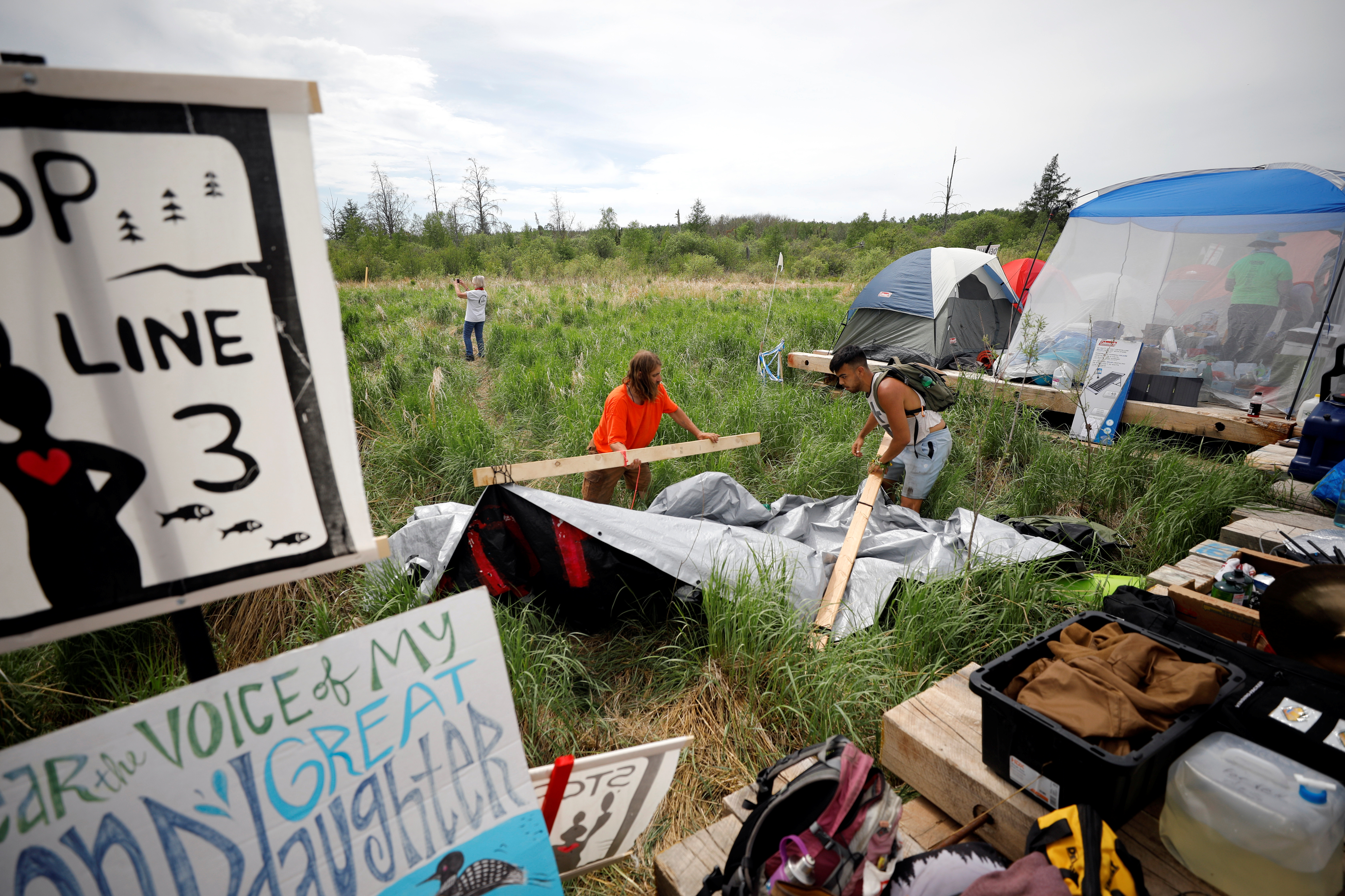 On June 7, the same day as the march, about 200 people set up tents on platforms the company built to allow heavy machinery to roll over the marshy land, in an effort to prevent construction.