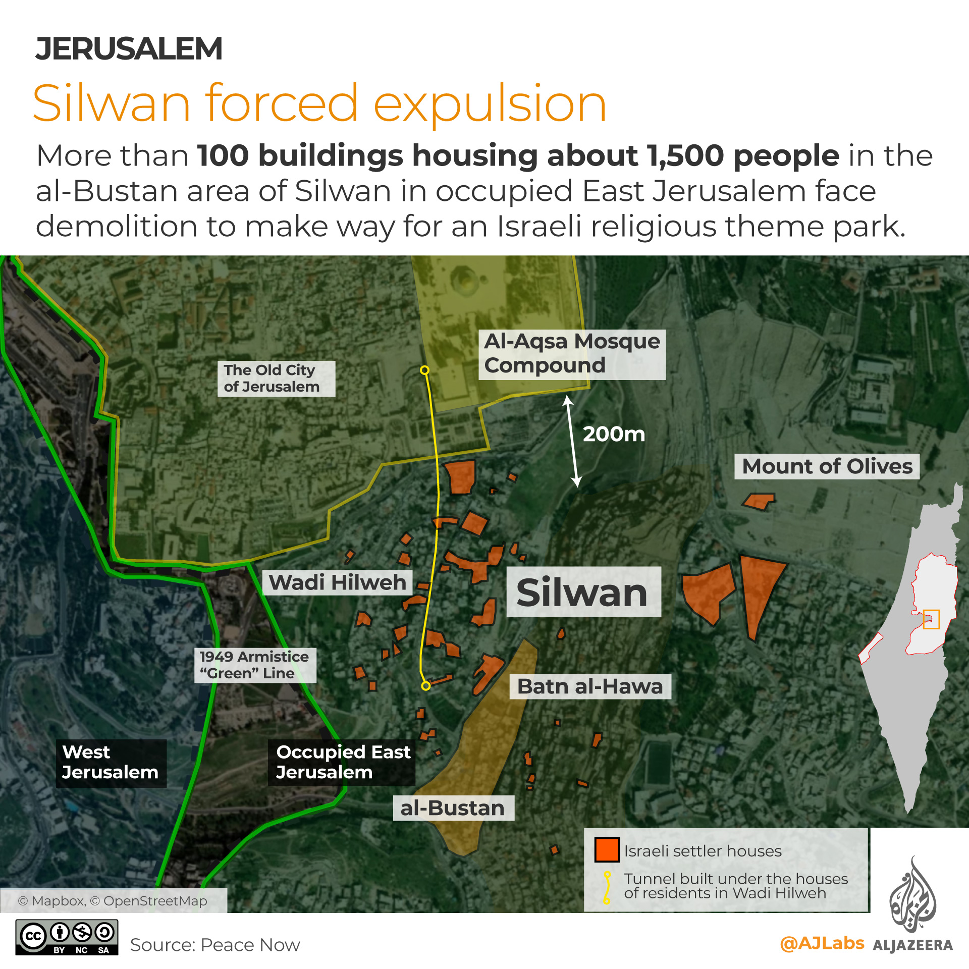 Since 2005, residents of al-Bustan have received warnings to demolish nearly 90 homes under the pretext of building without a permit, in favour of an Israeli settler organisation that seeks to turn the land into a national park and link it to the archaeological City of David area.