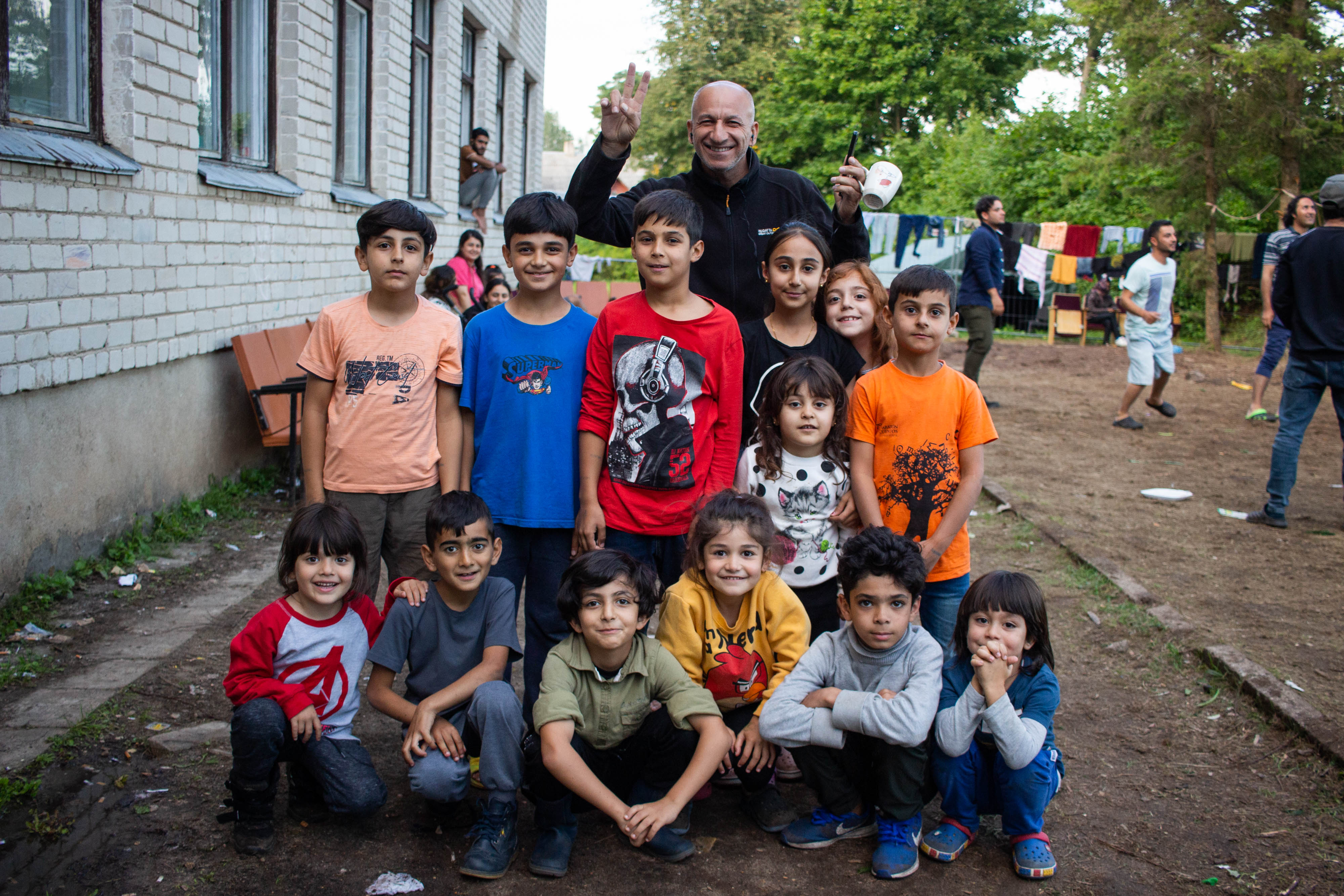 In the schoolyard, Bekhal Hama Saeed, a 42-year-old woman from Iraq, watches her children play. They are nine, seven and six years old. Her family shares a room with 20 people.
