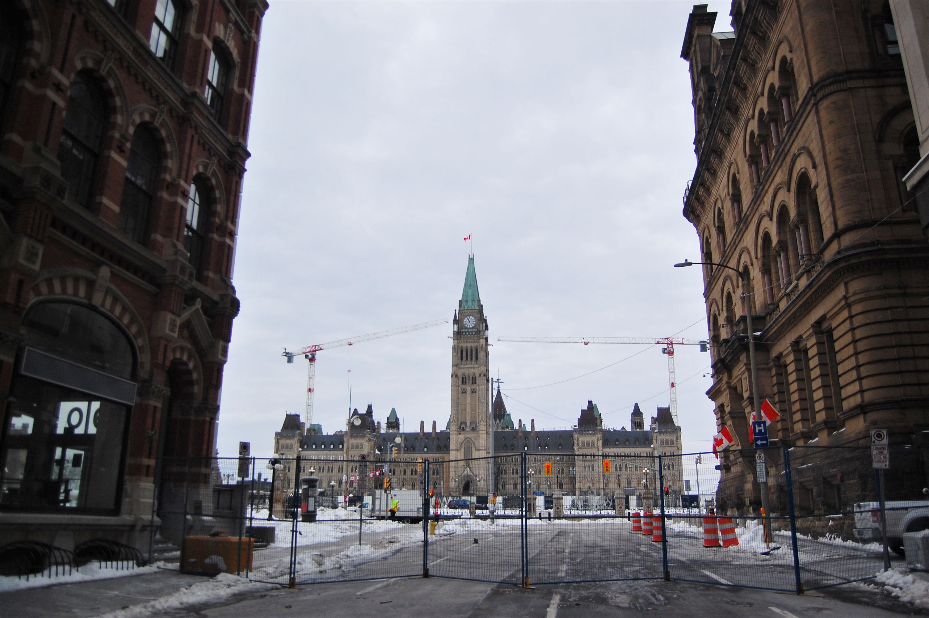 Outside Parliament Hill on Tuesday, small groups of police officers walked past blue fencing erected to control traffic in and out of the largely empty streets. A few restaurants and cafes were open, while a handful of workers in fluorescent vests cleared snow.