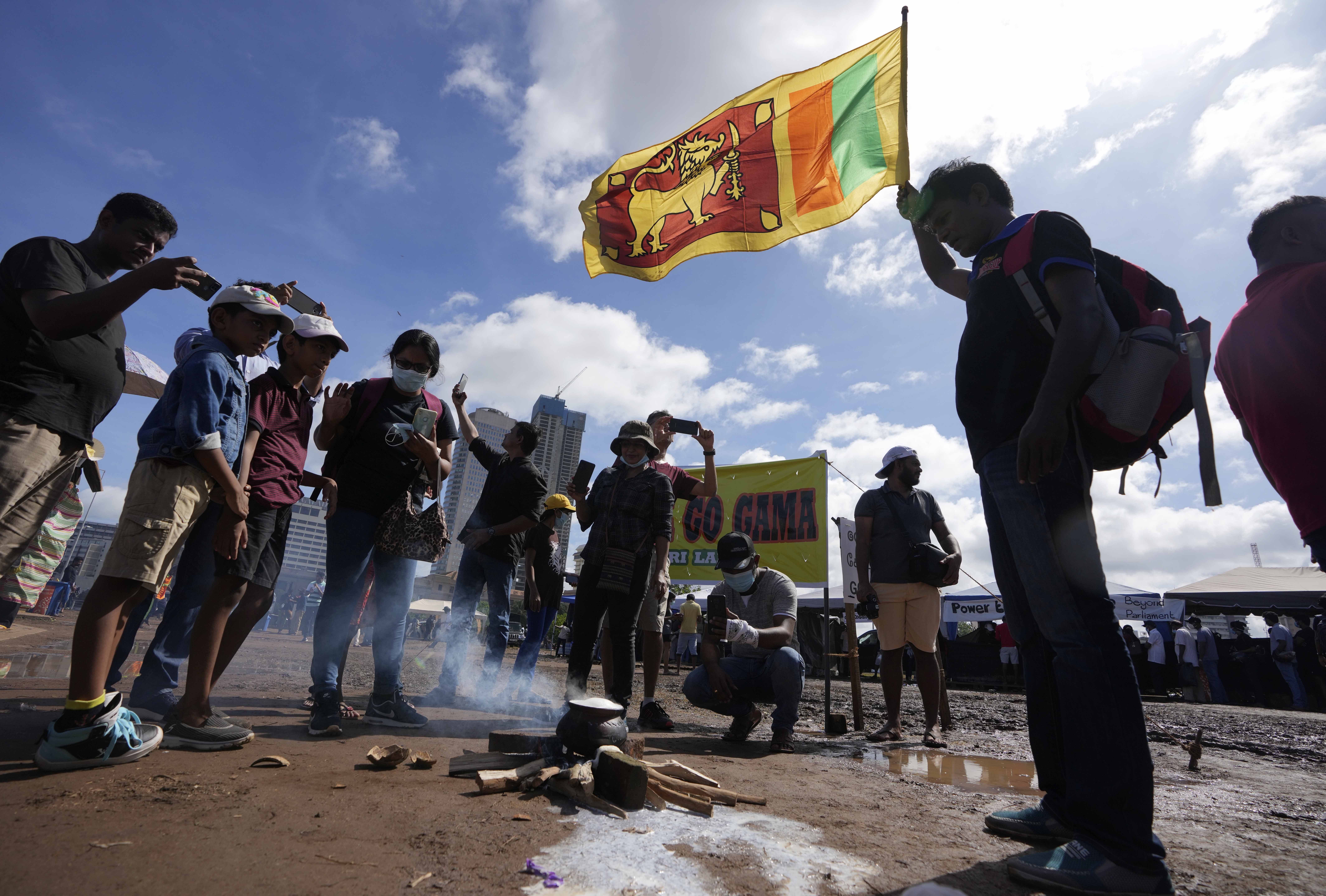 Sri Lankans have shared milk rice and oil cakes to celebrate their traditional new year opposite the president’s office, where they have camped out for six days demanding his resignation over the worst economic crisis in memory.