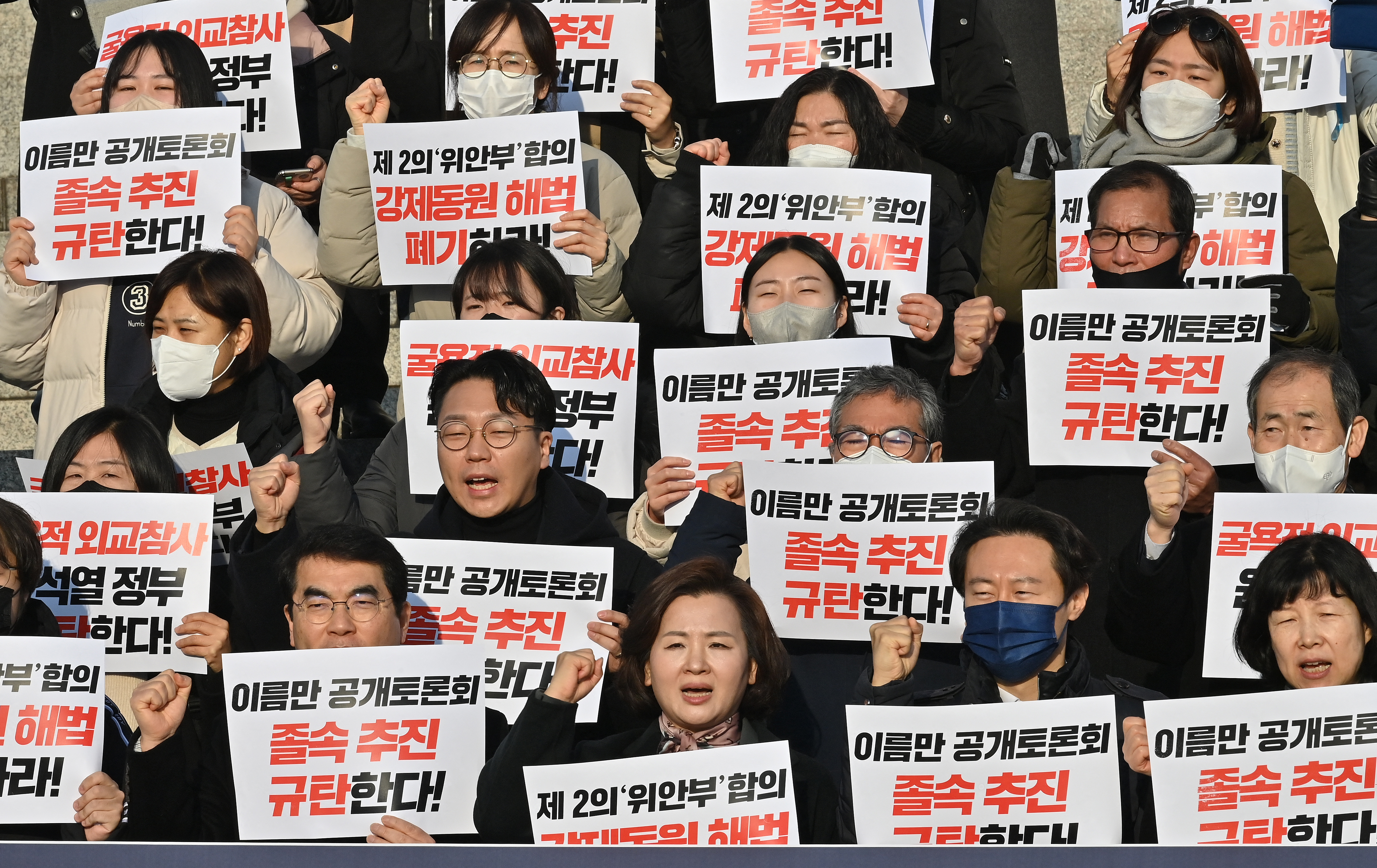 Some attendees held posters with the slogan “Apologise Japan” and jeered at officials.