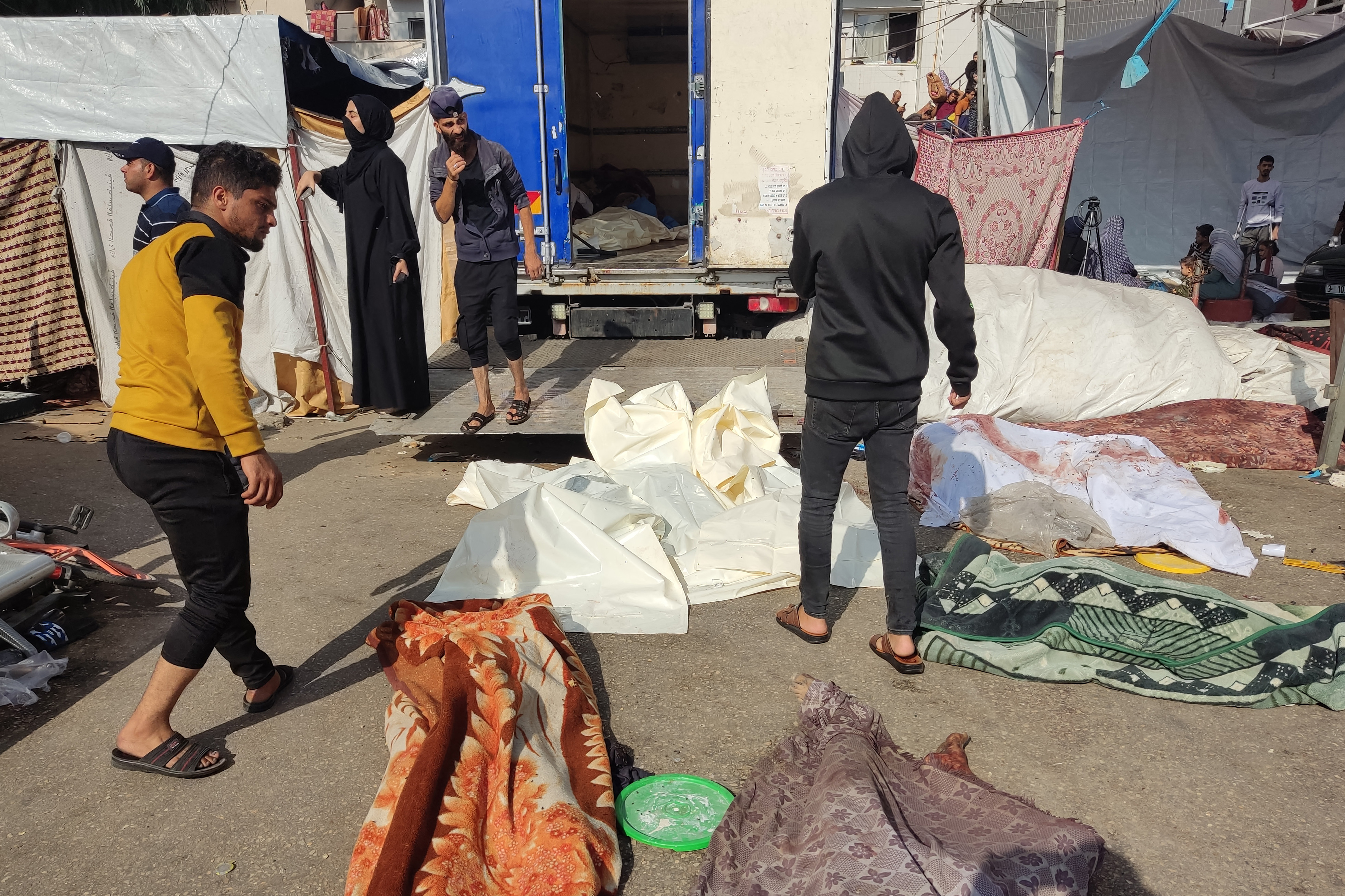 ![People check the bodies of victims killed in a reported Israeli strike, as they lie on the ground in the vicinity of Gaza City's Al-Shifa hospital compound on November 10, 2023. [Khoder al-Zaanoun / AFP]](/wp-content/uploads/2023/11/shifa-1699632821.jpeg?resize=770%2C513&quality=80)