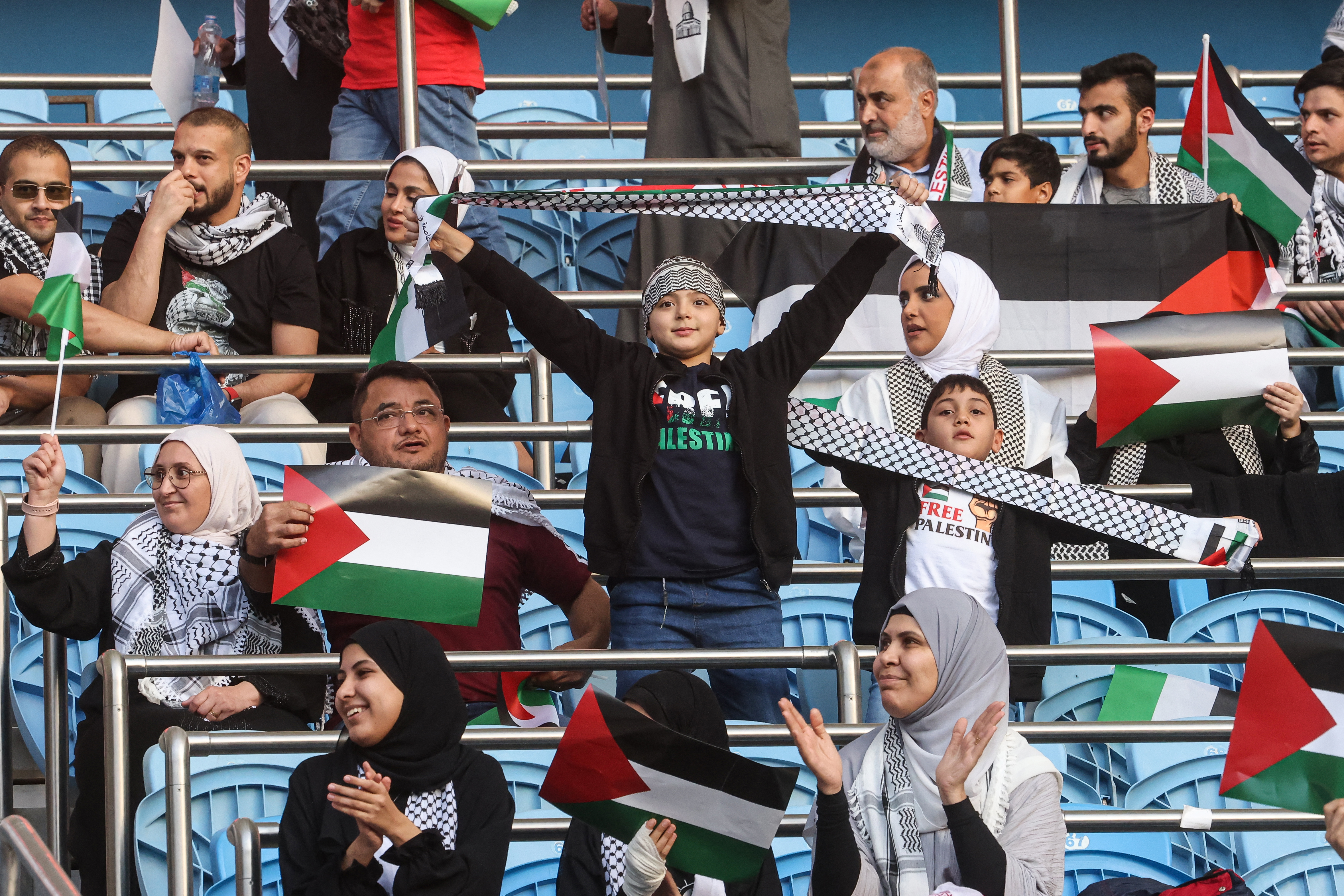 Palestine’s red, black, white and green flag was ubiquitous at the game – which was moved from Ramallah in the occupied West Bank because of the war – and many fans twirled the distinctive keffiyehs as they chanted.