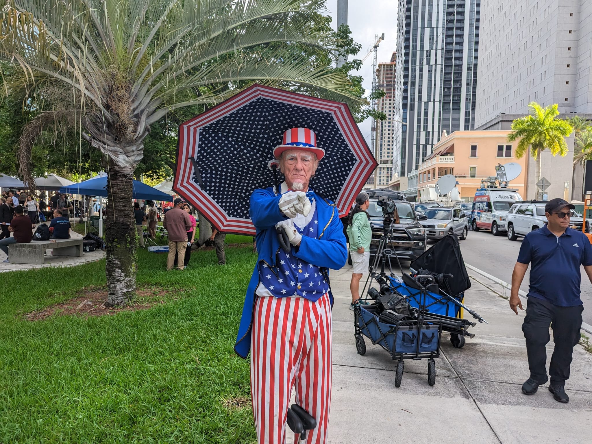 Miami, Florida – Encircled by journalists, a man dressed as Uncle Sam standing on a hoverboard sang an ode to former President Donald Trump and his supporters.