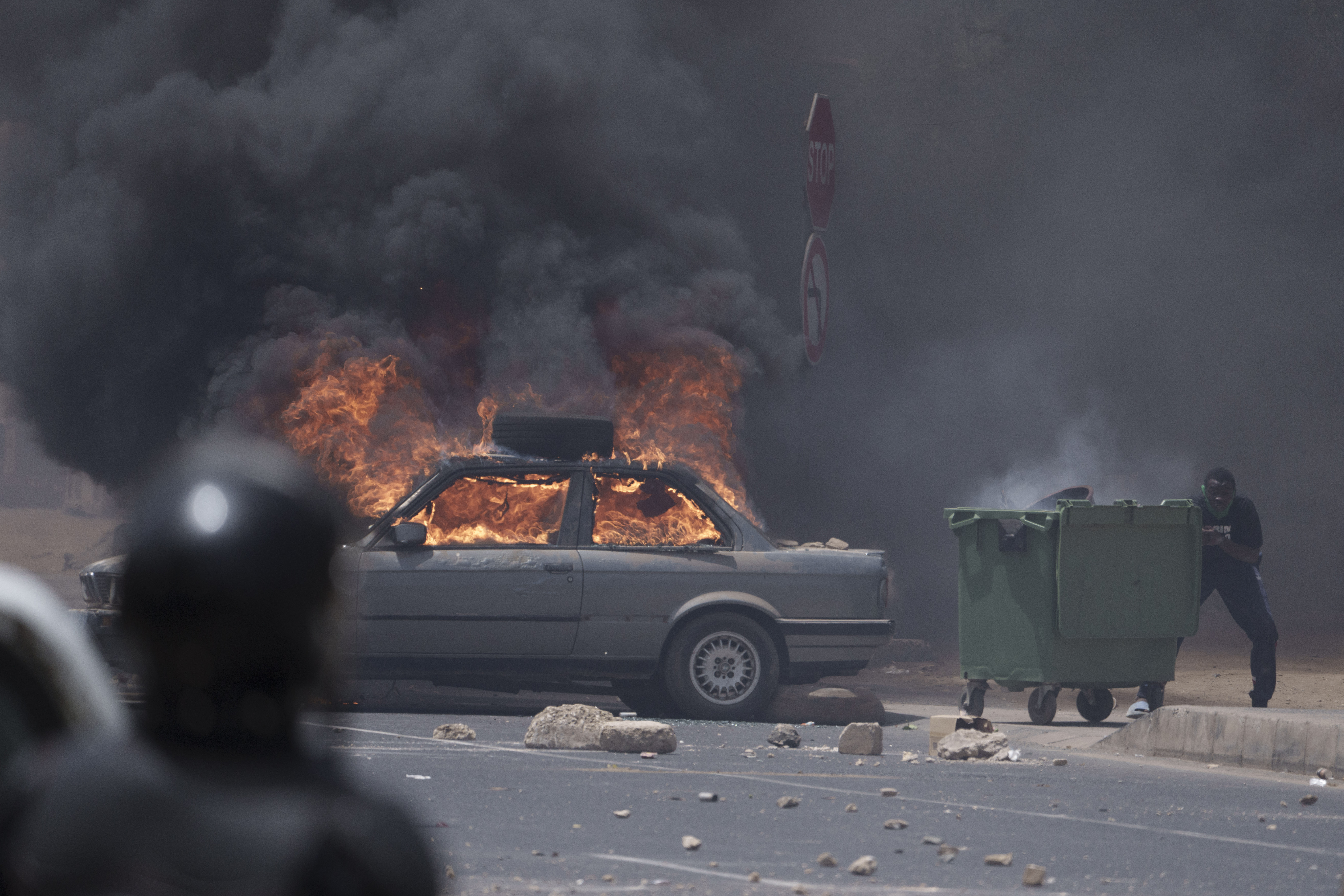 Thick black smoke billowed from a central university campus in Dakar, where protesters set several buses alight in the afternoon and threw rocks at riot police who responded by firing tear gas.