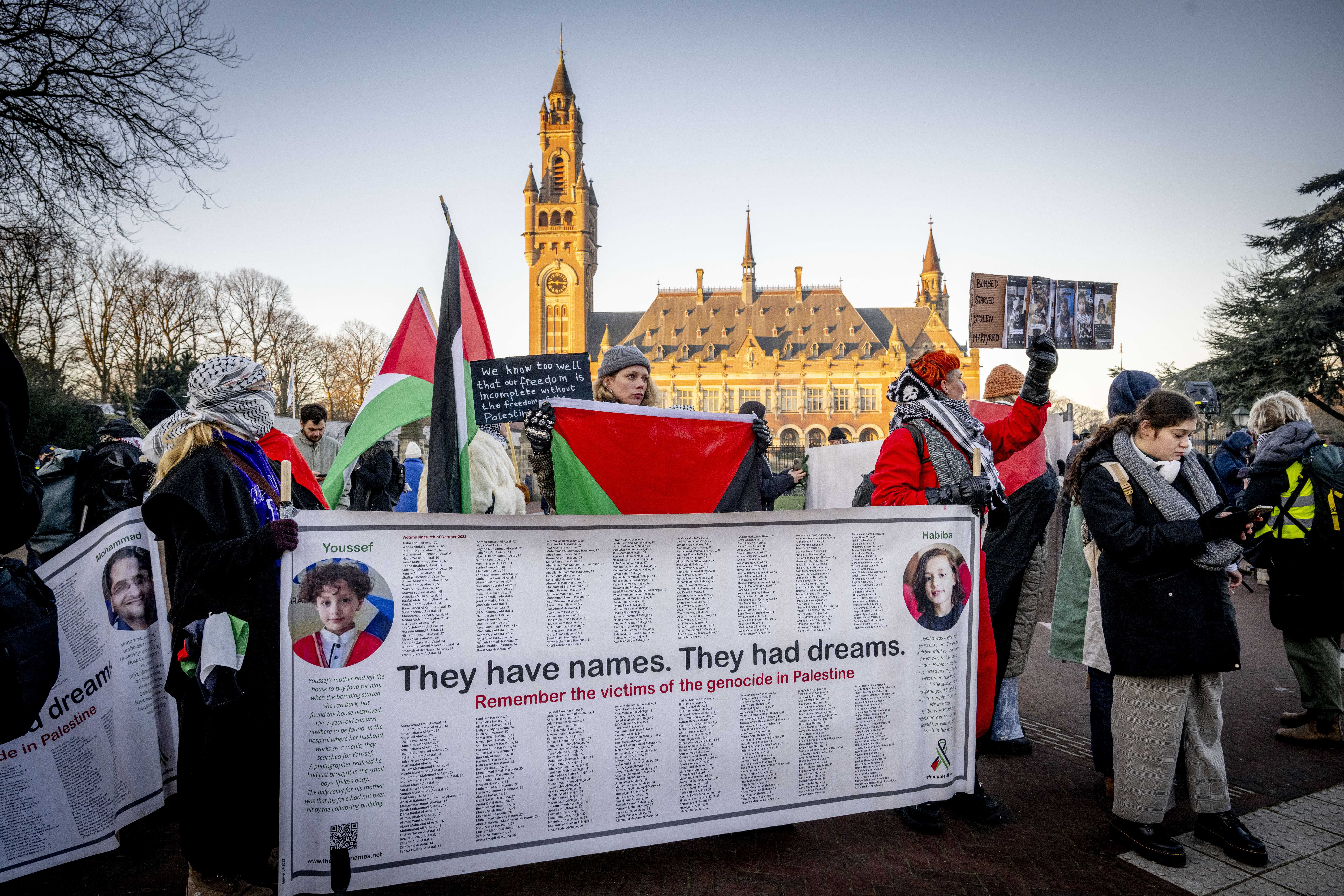 Outside the ICJ, a large number of demonstrators gathered to express solidarity with Palestinians and call for an end to Israel’s war, with people holding Palestinian flags and chanting occasionally: “Stop, stop genocide”, “We are all Palestinians” and “Boycott Israel”.