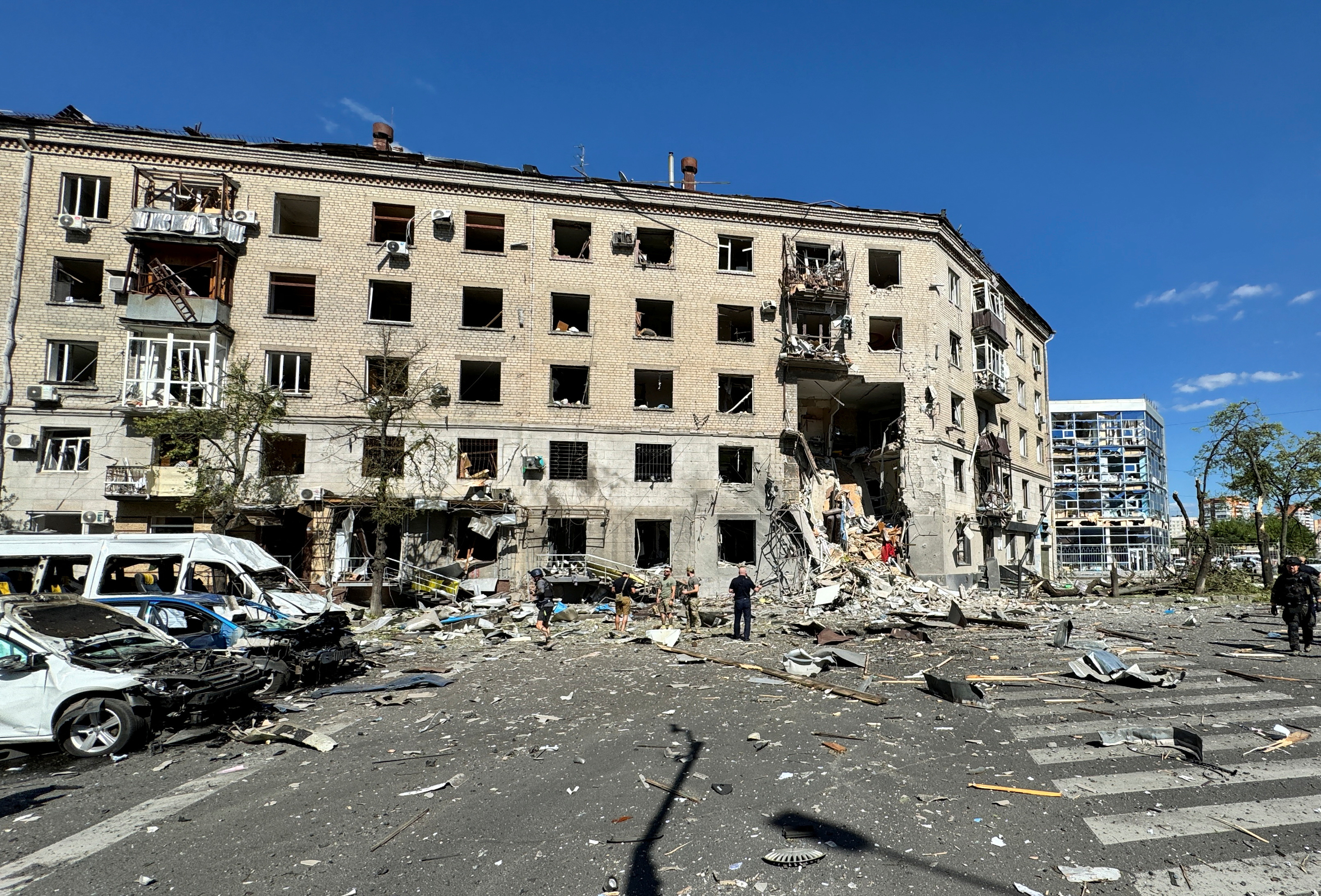 Syniehubov said rescue work is proceeding. Other civilian targets were also hit and public transport halted. Mayor Ihor Terekhov said there had been four strikes.