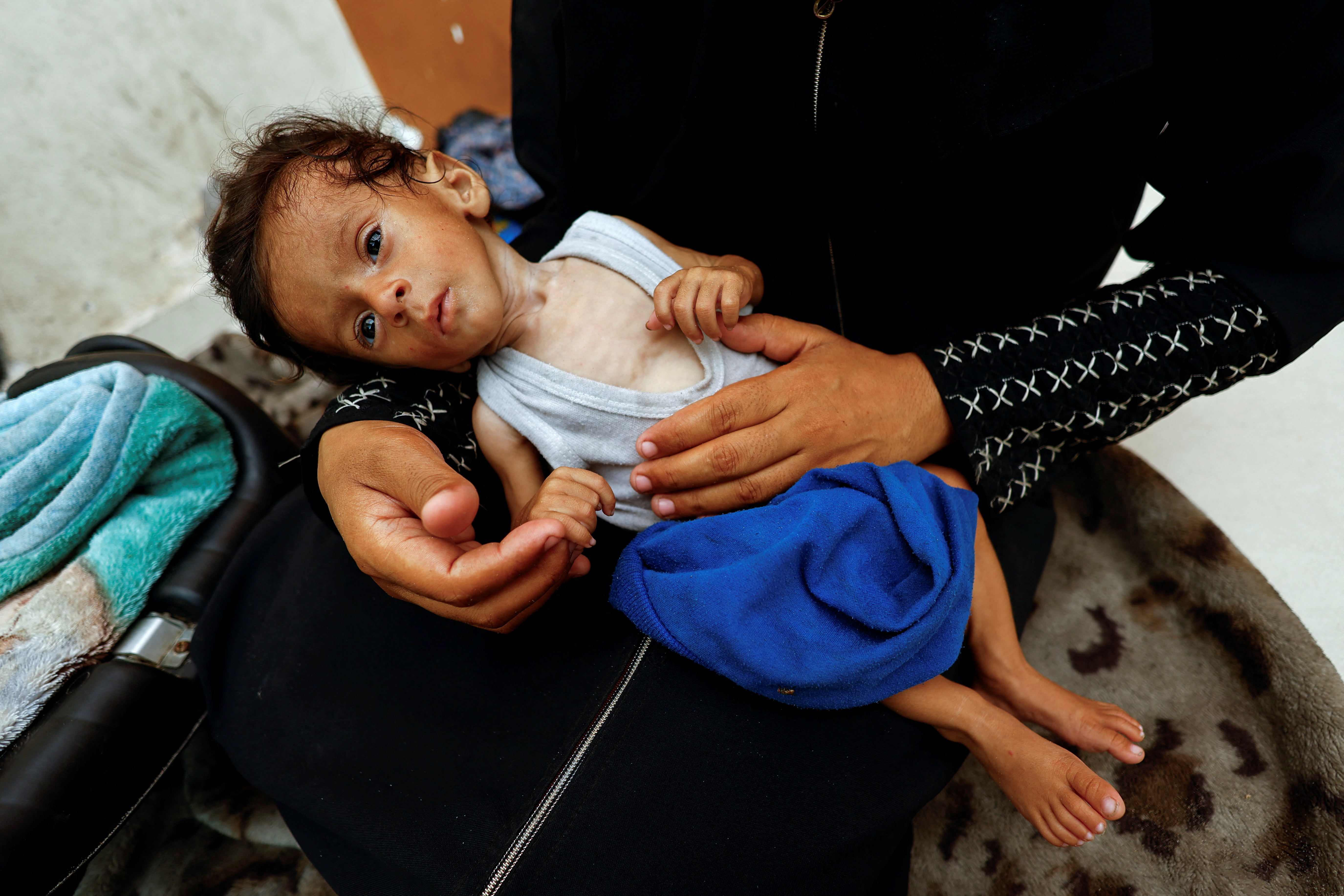 Other than the visible signs of extreme thinness, children suffering from severe malnutrition may show physical traits such as sunken, pale eyes, flaky skin, loss of hair and a swollen belly caused by oedema – fluid build-up in the body due to severe protein deficiency.