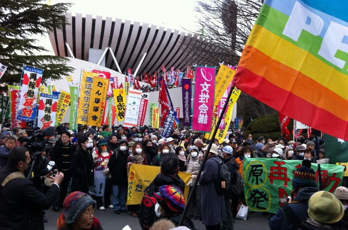 In this crowd, Oe is preaching to the choir, but on this day, having a high-profile figure on their side seems to give the crowd the boost they need to withstand the frigid wind and go on a march around the city centre.