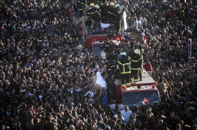 Thousands of people gathered on the streets of Mansoura during the funeral for the bomb victims.