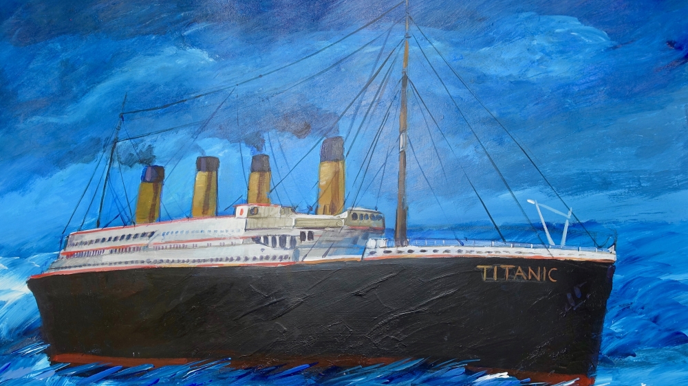 Many detainee-artists depict the sea or other bodies of water, and seafaring vessels, both great and small. Ghaleb al-Bihani’s “Untitled (Red and Purple Boats)” shows two simple wooden boats listing in the water, while an agile sailboat speeds past in the distance. Muhammad Ansi painted the grand Titanic – that ill-fated ship – after he, and other prisoners, were permitted to watch the film. In his painting, the infamous ship – one that was sold to the world as so advanced and powerful that it was unsinkable – is propelling itself purposefully into a future that its makers and financers imagined they controlled.