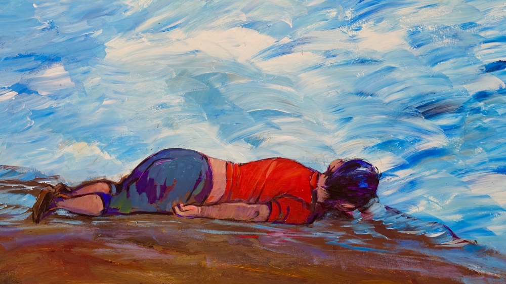 There are artworks that fall completely out of any of these easy attempts to categorise. Muhammad Ansi’s “Untitled (Alan Kurdi)” is clearly a painful contemplation of the three-year-old Syrian boy who drowned, almost within reach of the Greek island of Kos, in September 2015. The boy’s back is turned to us, the viewers, as it was in news photographs. The brilliant red of his shirt stands stark against the blue half-saucers of sea waves, which, through Ansi’s paint-strokes, also become as light as the sky – the heaven to which this child’s soul departed.