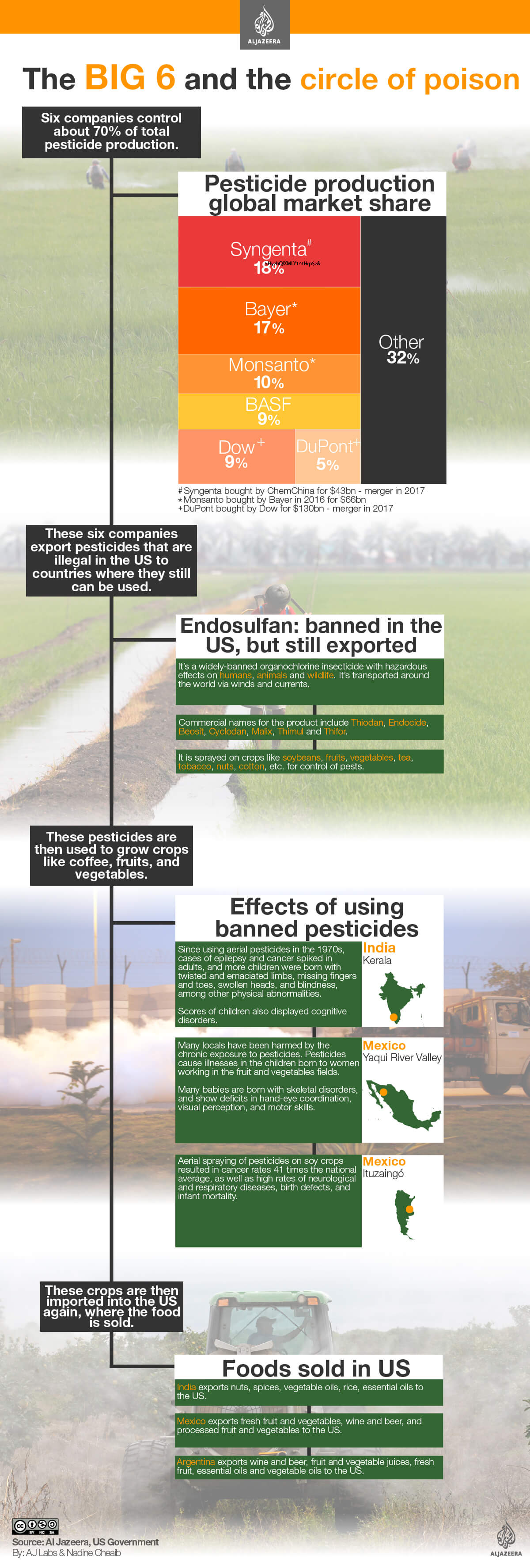Today, at least 75 percent of the global pesticide trade is controlled by six large agrochemical companies – Monsanto, Dow, Bayer, Syngenta, Du Pont and BASF. These corporations form powerful lobby groups which drive and shape legislation that regulates farming and food production. This influence has protected the industry, particularly in the US.