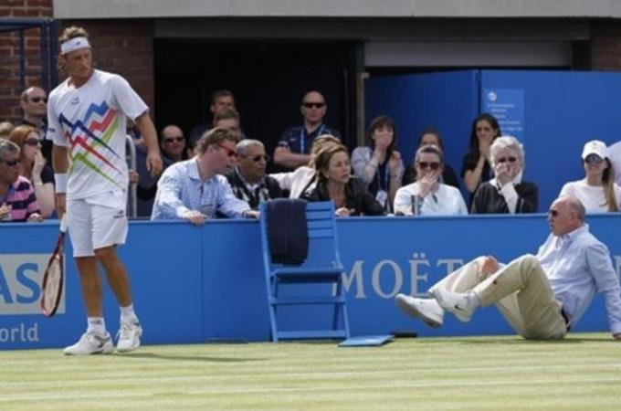 After missing a running forehand on game point, he kicked the board under the chair of line judge Andrew McDougall. A piece of the board cut the judge on the left shin, leaving him bloodied from an inch long gash.