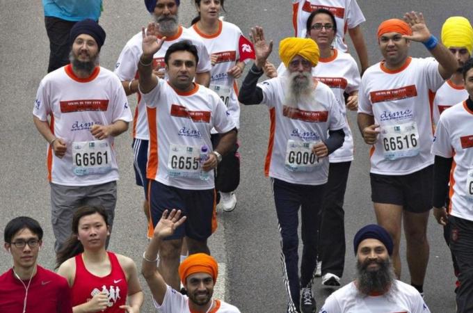 Singh, a Sikh, wore a saffron turban and sported a flowing white beard. As he followed the route along the northern lip of Hong Kong island, he was accompanied by a group from the city’s local Sikh community, joining about 72,000 other runners taking part in the marathon.