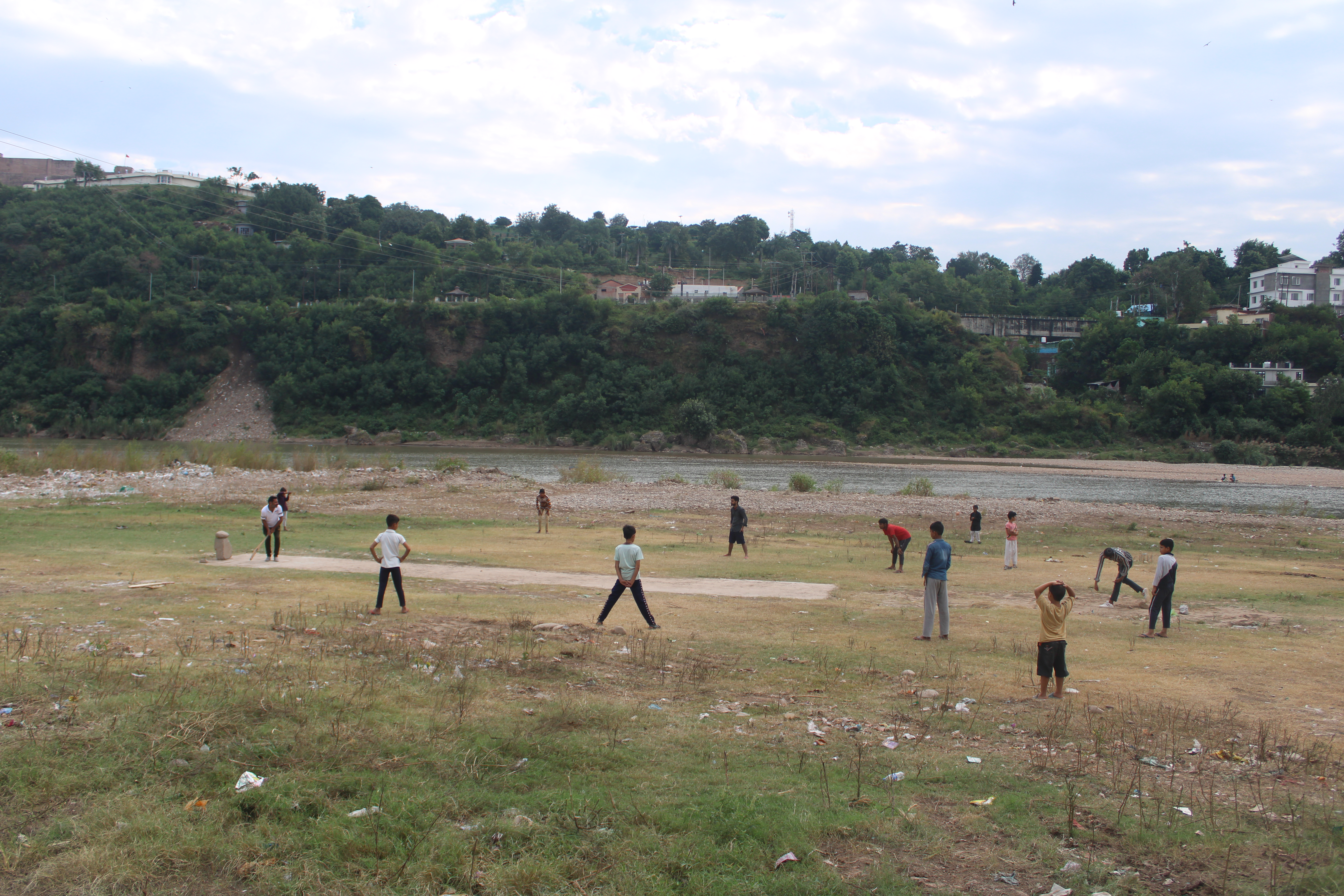 Jammu, Indian-administered Kashmir – A group of youngsters are playing cricket on a small ground along the Tawi River in Gujar Nagar locality of Jammu city early in the morning.