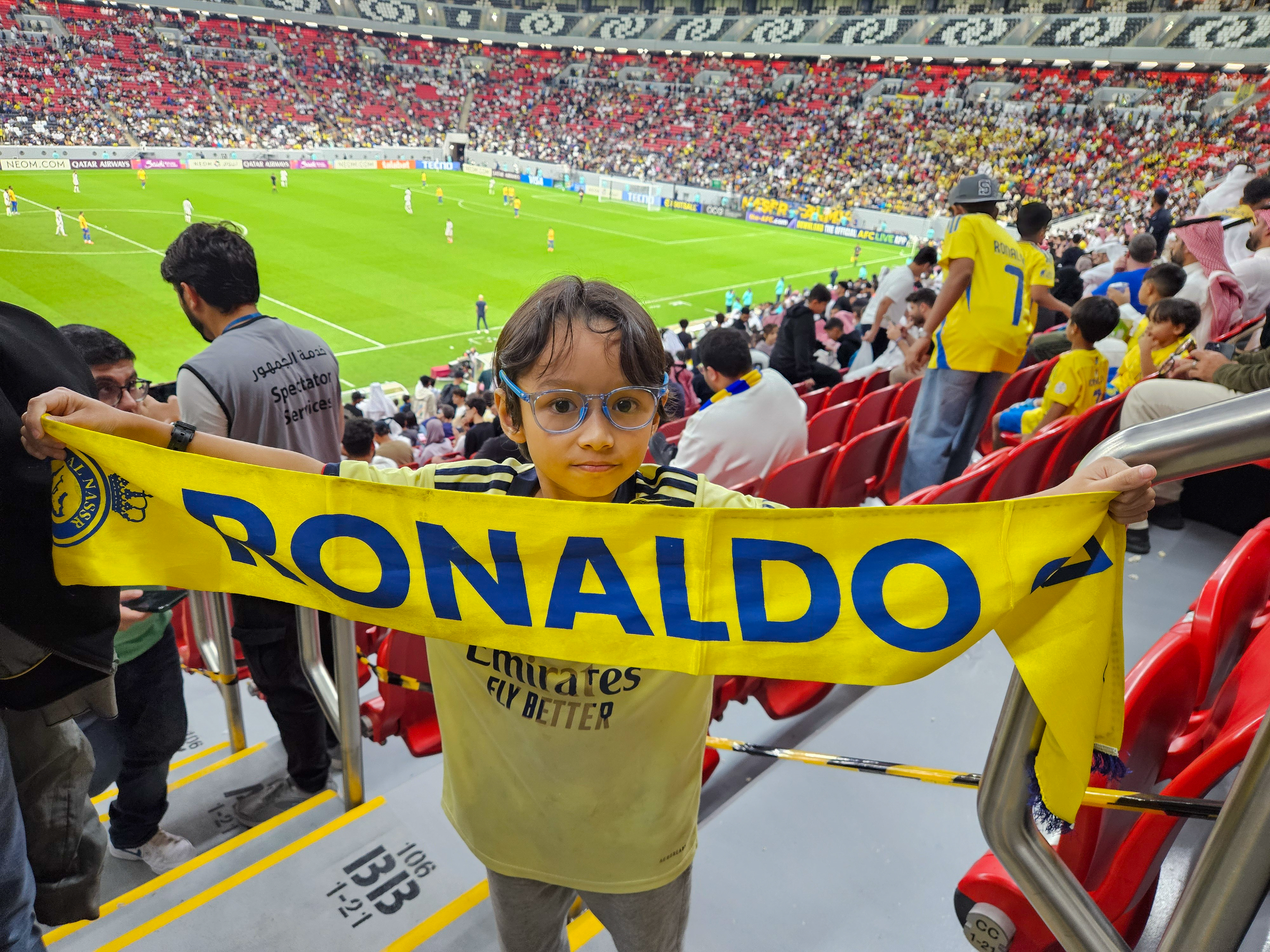 Harshveer Singh, an eight-year-old Ronaldo fan, was one of the thousands of young supporters who came to Al Bayt Stadium dressed in Al Nassr’s blue and yellow kit with Ronaldo’s name and famous number seven emblazoned on the back.
