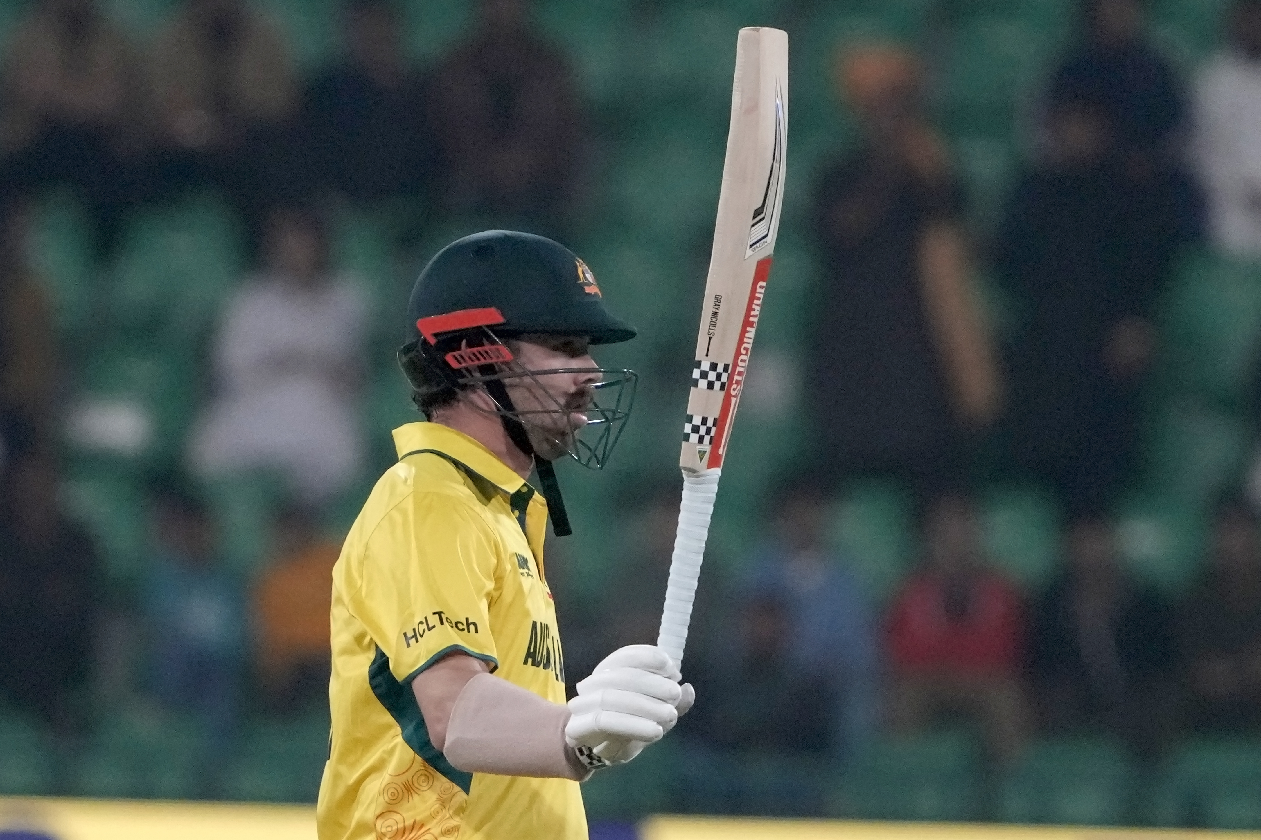 Travis Head’s 34-ball half-century had provided Australia with a rollicking start against some scratchy Afghanistan fielding and poor fast bowling. Rashid Khan couldn’t hold onto a regulation catch when Head was on six. Head cut loose and motored Australia to 90-1 in the batting powerplay.