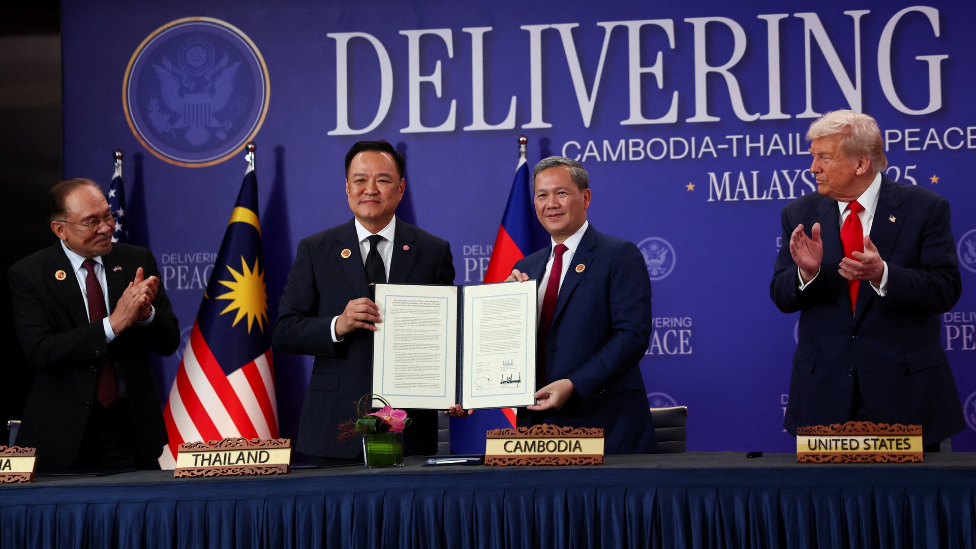 ![Thai Prime Minister Anutin Charnvirakul, left, and Cambodian Prime Minister Hun Manet shake hands during the signing of a ceasefire on the sidelines of the Association of Southeast Asian Nations summit in Kuala Lumpur, Malaysia, on October 26, 2025 [Evelyn Hockstein/Reuters]](/wp-content/uploads/2025/10/2025-10-26T073859Z_1114568740_RC2IJHAUK2UZ_RTRMADP_3_ASEAN-SUMMIT-1761555703.jpg?resize=770%2C513&quality=80)