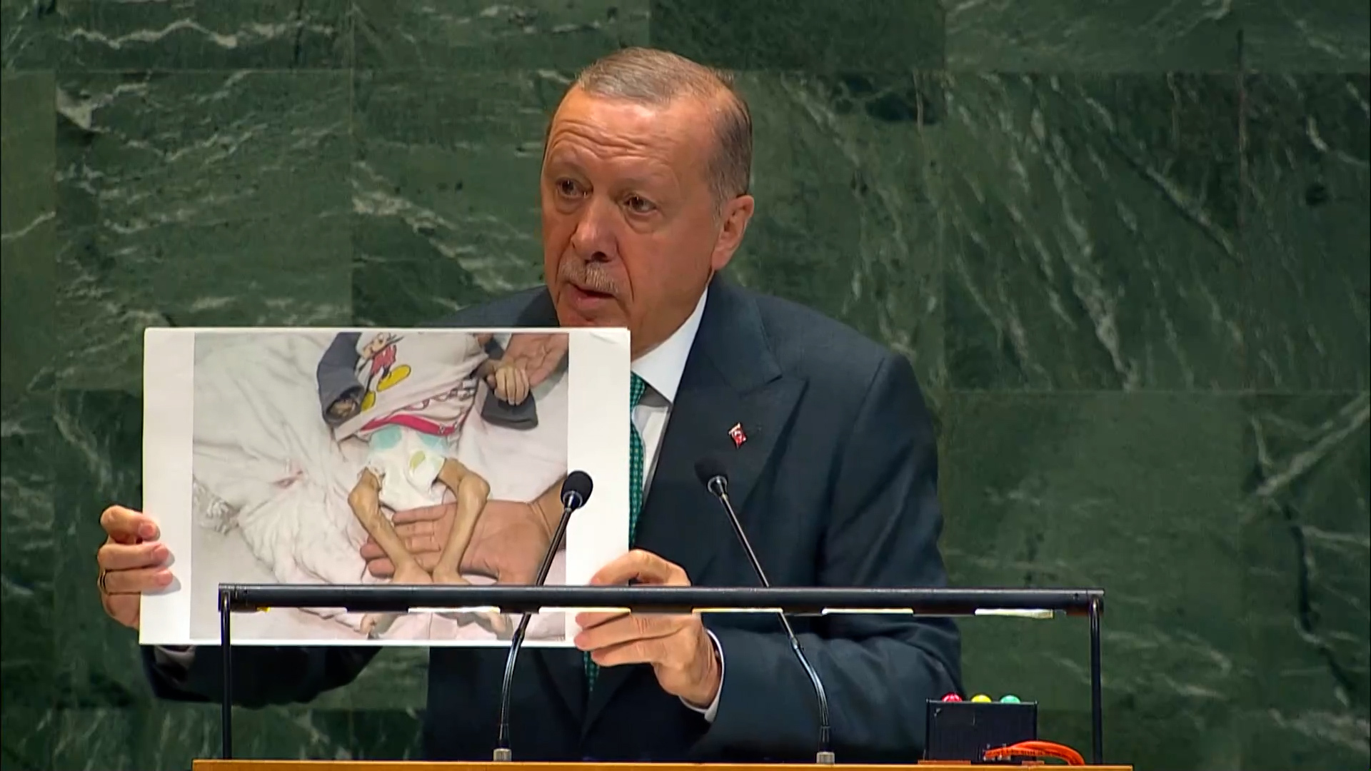 Turkish President Recep Tayyip Erdoğan held up a photo of a child starving in Gaza and urged the world take action.