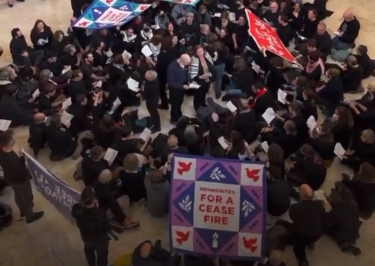 Around 150 people were arrested after a sit-in protest inside the US Congress calling for a ceasefire in Gaza. Members of the group Mennonite Action sang songs and hymns as they called for peace and justice.